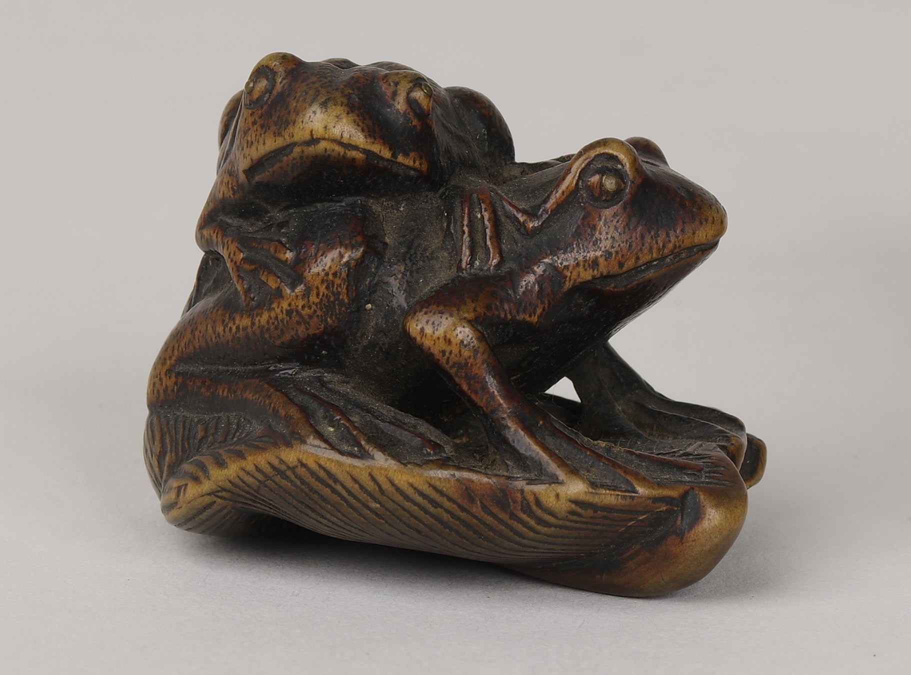 芭蕉の葉の上に2匹の蛙が乗っています。おそらく親子の蛙と見え、上に乗る蛙は下の蛙に甘えてしがみつくようです。蛙の表面のざらざらした質感まで丁寧にあらわされています。