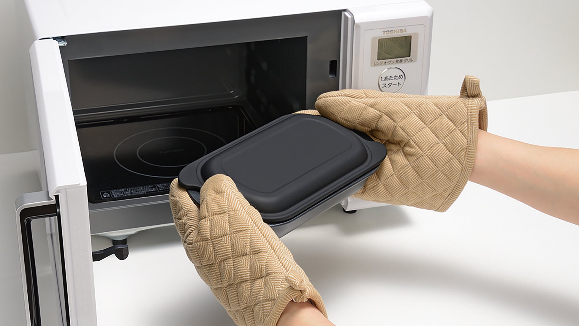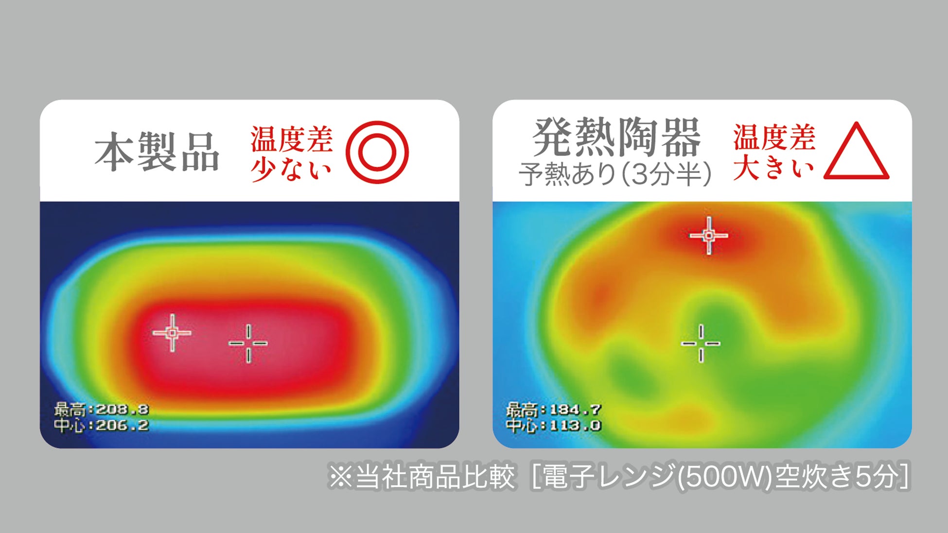 マイクロ波を受けた発熱シリコーン自体が熱源となるため、極めて均一な温度になります。熱ムラが少ないので手軽にフライパンやロースターで焼いたような調理ができます。