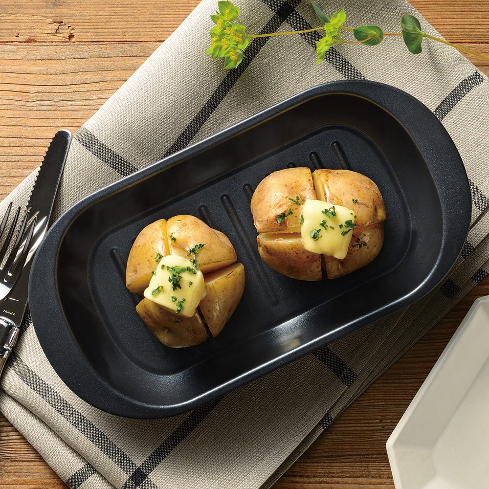 マイクロ波でプレート裏の特殊素材が発熱し、予熱は不要ですぐに調理ができます。直火並みの温度で加熱され、まるでフライパンで焼いたような焼き目がつけられます。最高温度は220℃です。