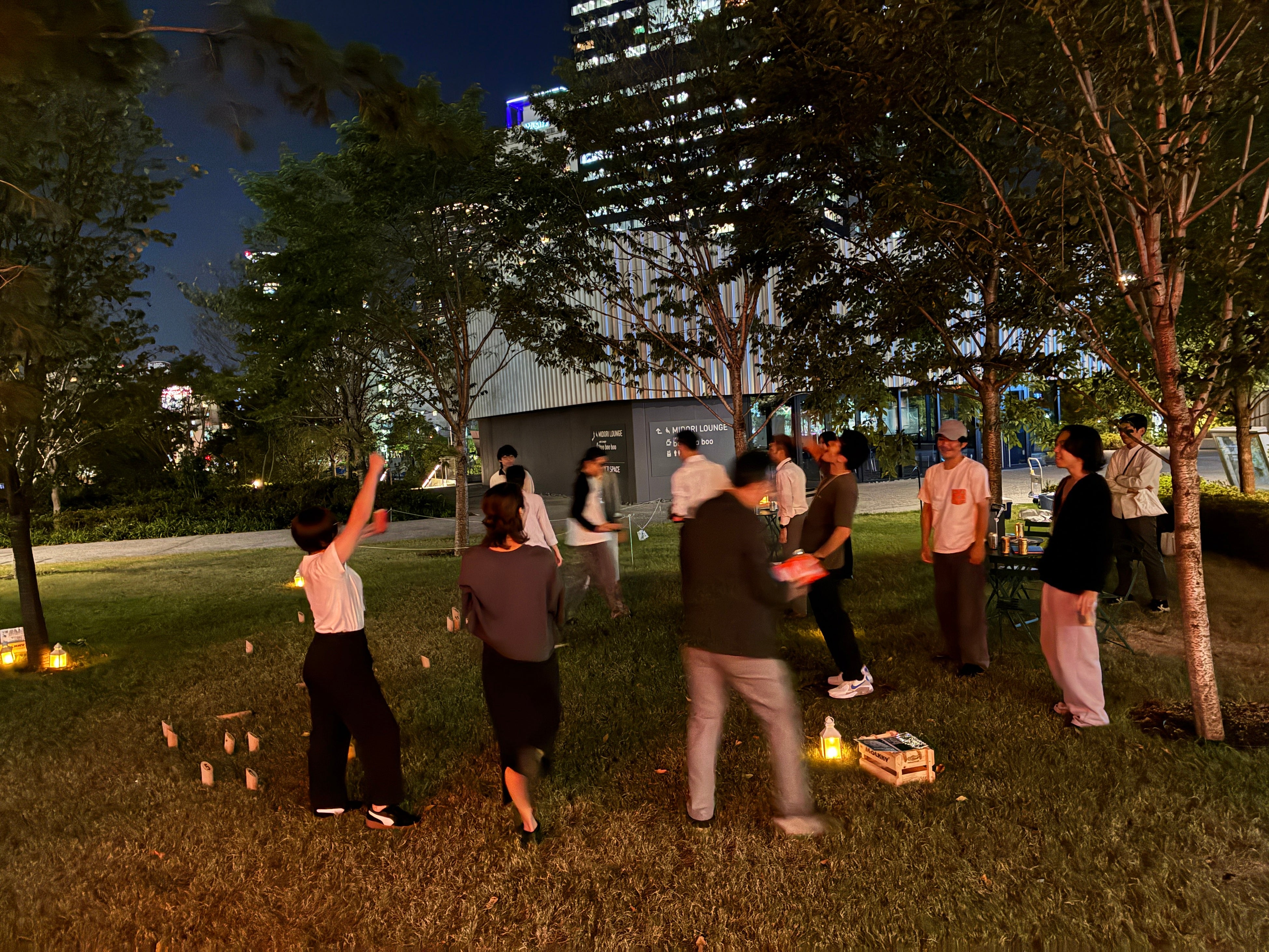 芝生広場には、寒さの中でも温もりを感じられる空間として、直径11m・高さ6mの巨大透明ドームテント「THE DOME」を設置。昼はくつろぎのラウンジとして、夜は光と音のパフォーマンス空間として表情を変え、訪れる人をやわらかく包み込みます。さらに水盤エリアには、高さ4m、幅15mの篝火(かがりび)型シグネチャーモニュメント「THE KAGARIBI」を展開。都市のど真ん中に浮かび上がる“揺らめく炎”の光と、焚火を囲んでいるような音楽で、来街者のまなざしを惹きつけ、体感温度を上げる、象徴的な存在となります。