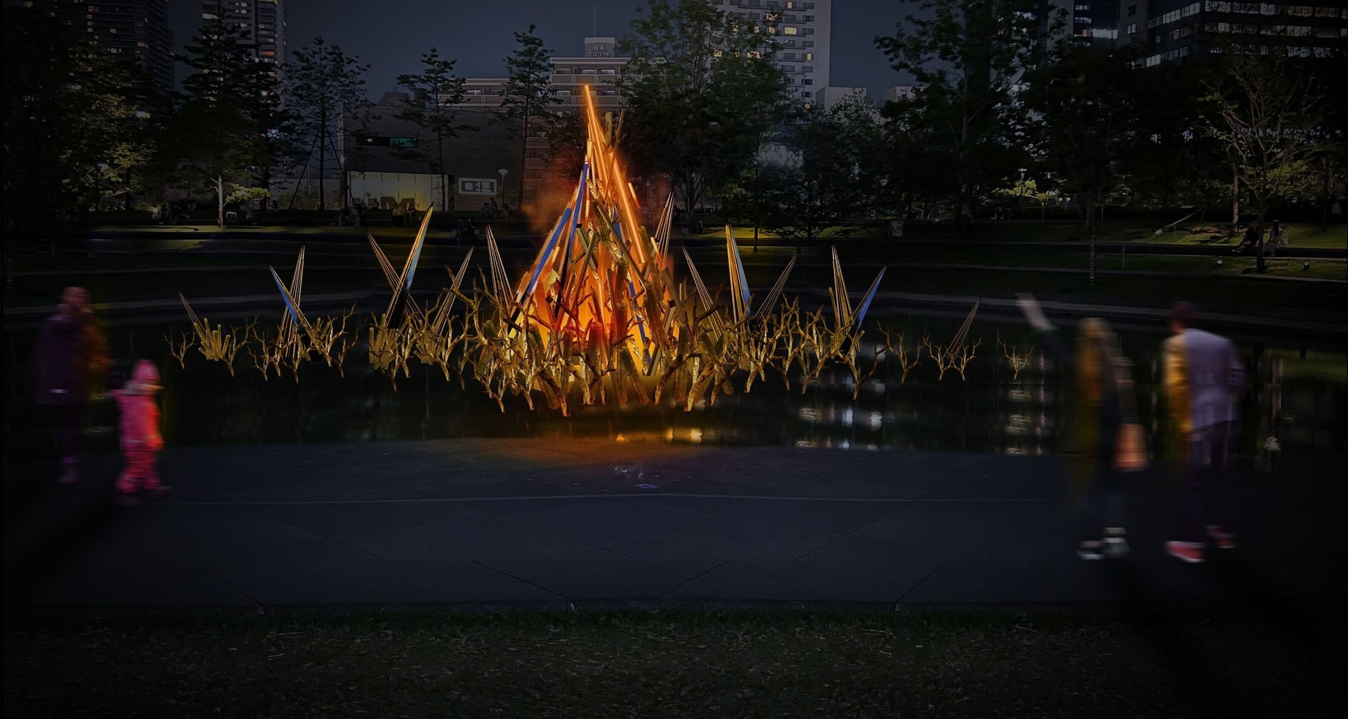 ~都市公園に人々が集い、交わることで生まれる温かさの象徴、高さ4m・幅15mの光のインスタレーション~