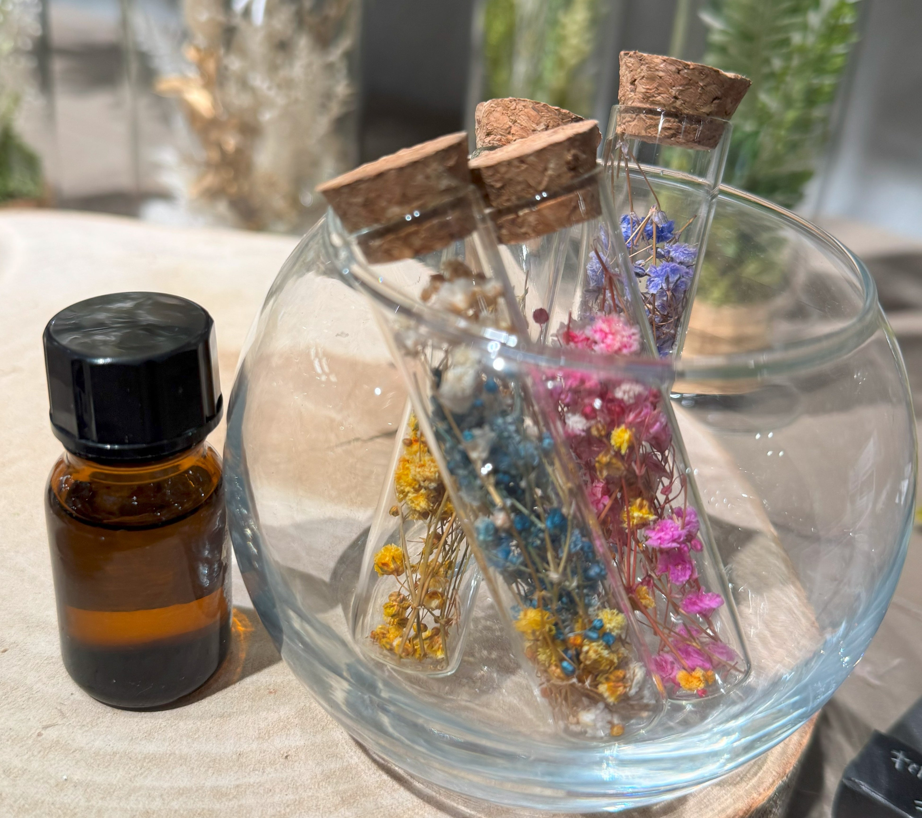 ドライスワッグ、ミニブーケ、木製オーナメントなどを販売します。また、小型瓶にドライフラワーと香りのある精油を詰めるセルフワークショップも実施します。THE DOMEのラウンジを開放しながら一角で開催します。