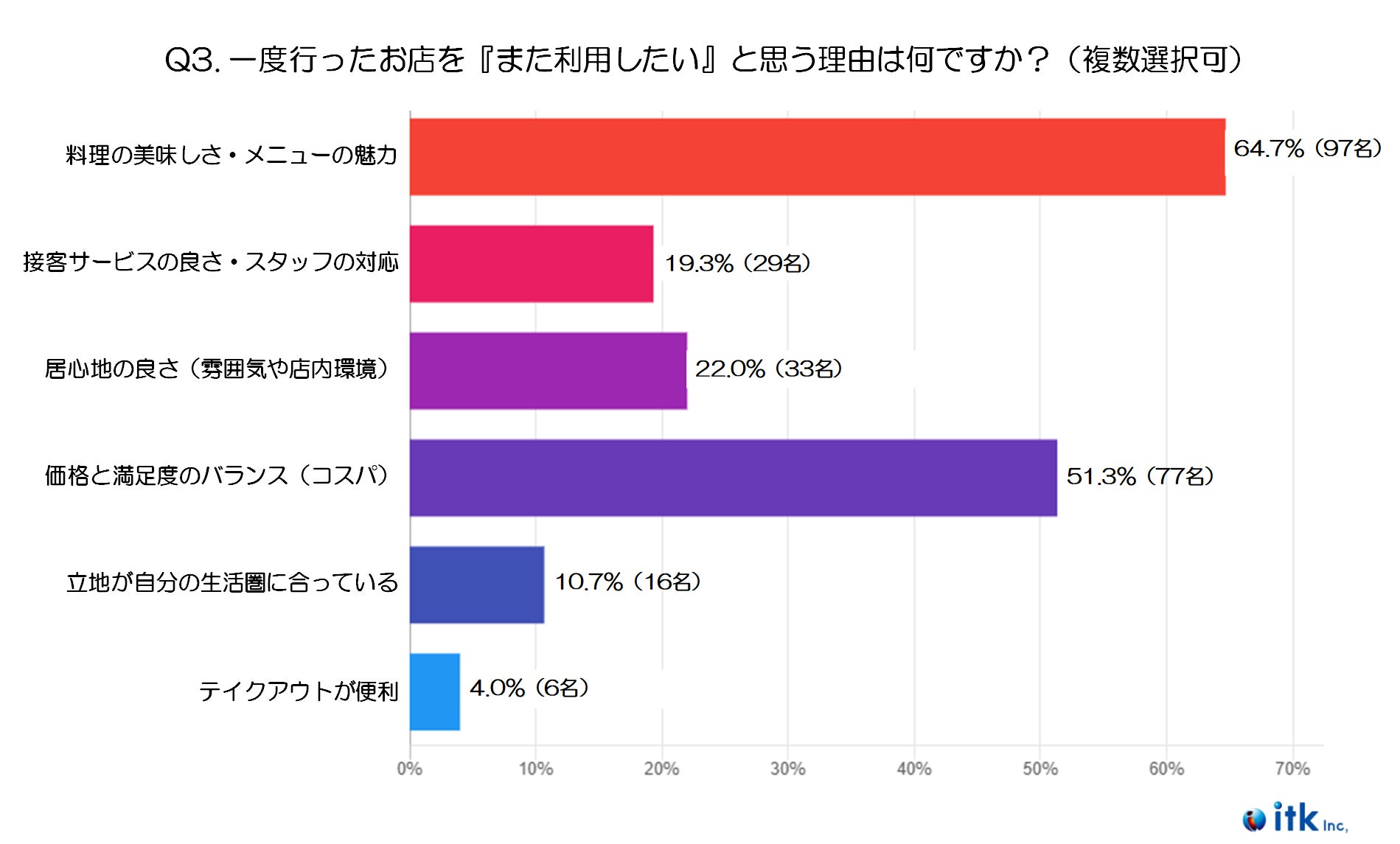 一度行った店を再訪したい理由に関しては「料理の美味しさ・メニューの魅力」が最多で、次いで「コスパ」や「接客サービス」「居心地の良さ」なども重要視されました。