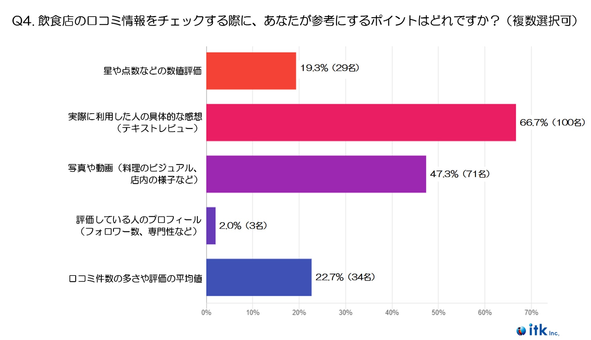最も多かった回答は「実際に利用した人の具体的な感想(テキストレビュー)」で66.7%にのぼっており、続いて「写真や動画(料理のビジュアル、店内の様子など)」が47.3%となっています。つまり40代の多くは、単なる星や点数といった数値評価よりも、実体験にもとづいた具体的な情報や視覚的なイメージを重視して店選びをしていることがうかがえます。