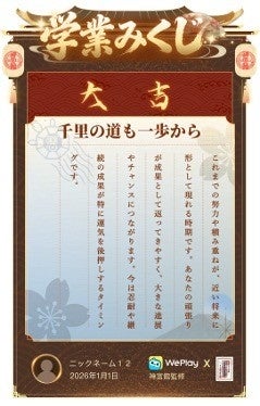 今回、WePlayは、明治41年(1908年)創業、暦や易学書の出版・販売を専門とする、百余年の歴史と伝統を誇る出版社「神宮館」との初コラボレーションによる「開運おみくじ・新年のご加護」イベントを開催いたします。開催期間は2025年12月30日12時から2026年1月5日24時まで。このアプリ上イベントで、ユーザーは初詣のようにおみくじを引き、新年の運勢を占うことができます。