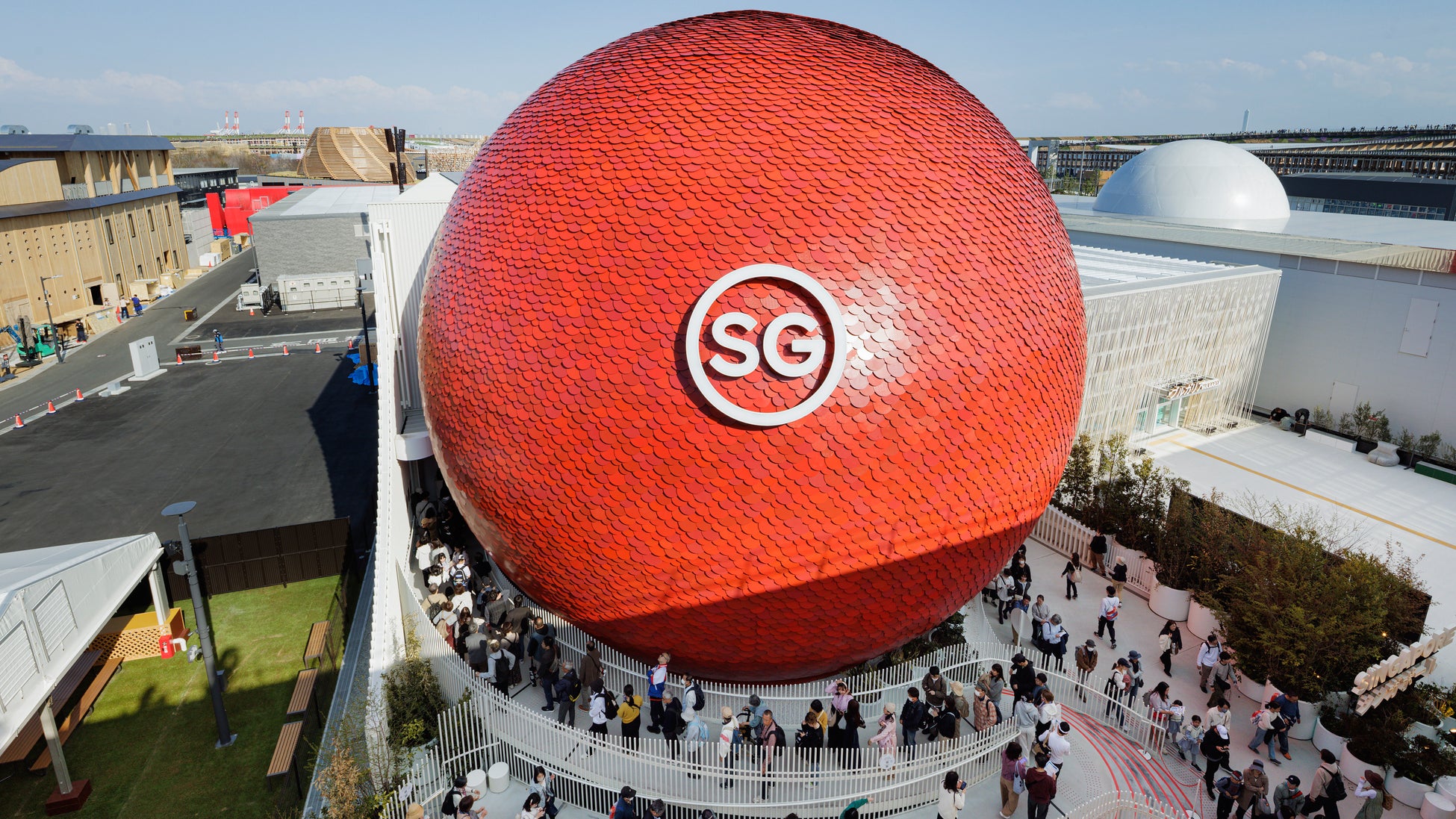 ドリーム・スフィア(夢の球体)と呼ばれるシンガポールパビリオンは、シンガポールの未来に向けた大きな望みを紹介する没入型の空間で、「リトル・レッド・ドット(小さな赤い点)」というシンガポールのニックネームにインスパイアされています。外観は、17,000枚を超えるリサイクル・アルミニウム製の「ドリーム・ディスク」で構成されており、それぞれのディスクは異なるサイズ、色合い、質感を持ち、多様な夢を表現しています。これらのディスクが重なり合うパターンは、日本と海外の人々にもよく知られる日本の伝統的な「青海波(せいがいは)」の波模様と、願いや想いを込めて書き記す「絵馬」からインスピレーションを得て、独自にデザインされています。