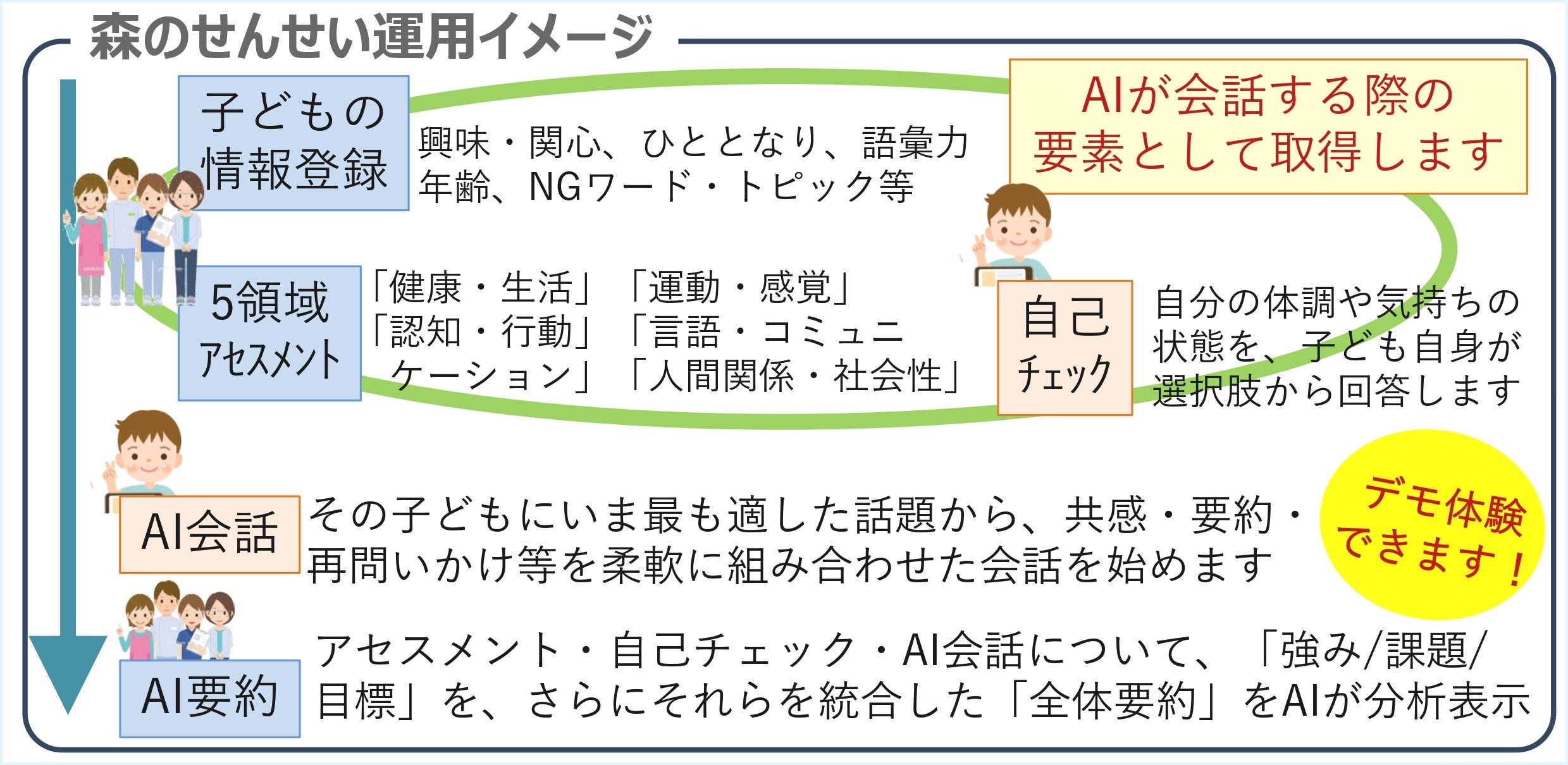 現在、『森のせんせい』の利用イメージを掴んでいただくための体験機会を提供中です。AIとの会話や要約機能を実際にご確認いただけます。