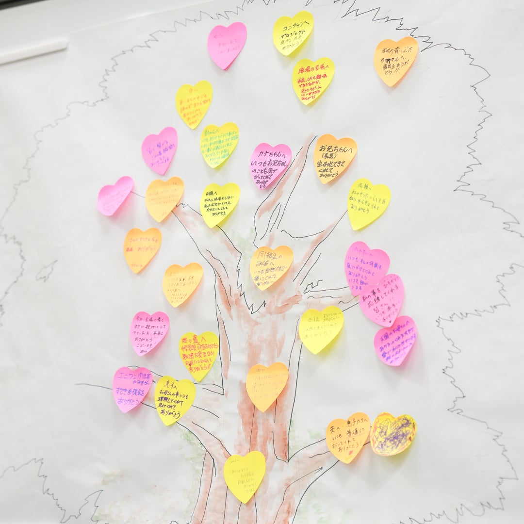 会場参加者のメッセージは〈ありがとうの木〉へ、オンライン参加者のメッセージは〈寄せ書き〉へ集められました。