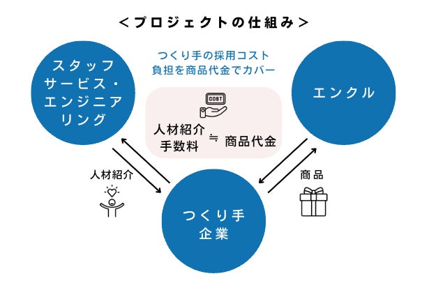 本プロジェクトでは、エンクルが採用支援を希望するつくり手企業の商品を買い上げることで、企業の採用活動にかかる負担を最小限に抑える仕組みを導入します。これは、一般的な採用活動でかかる求人掲載費や人材紹介手数料などのコストを商品売上で担保するもので、つくり手企業側は採用にかかる費用負担を抑えながら必要な人材と出会う機会を得ることができ、エンクルは買い上げた商品を在庫として確保し販売をいたします。