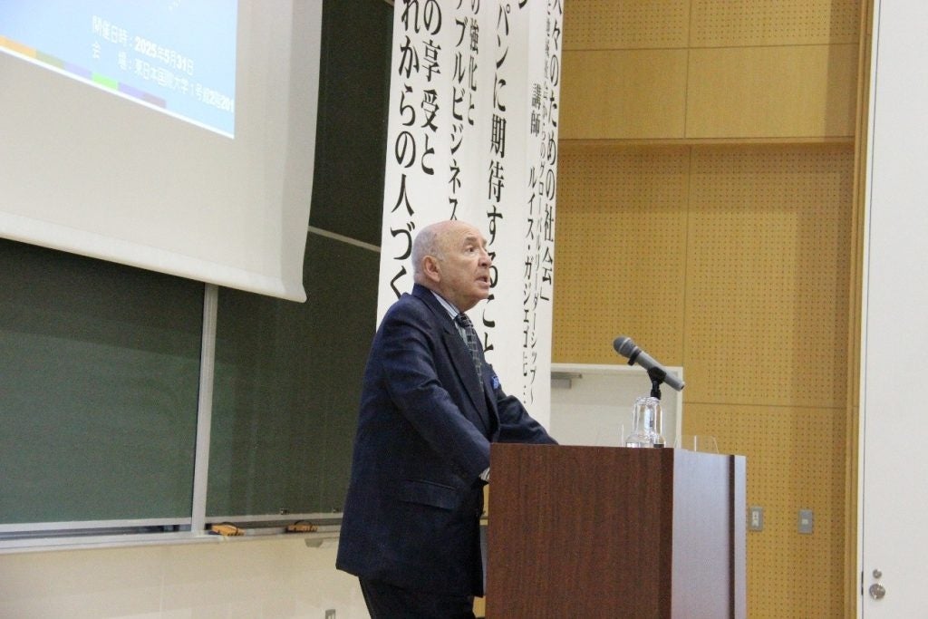はじめに基調講演が行われ、ルイス ガジェゴCIFALジャパン名誉議長(国連ニタール前評議会議長、元エクアドル外務大臣)が「全ての人々のための社会:国連の目指す平等と共生社会と地域社会からのグローバルリーダーシップ」のテーマで講演しました。