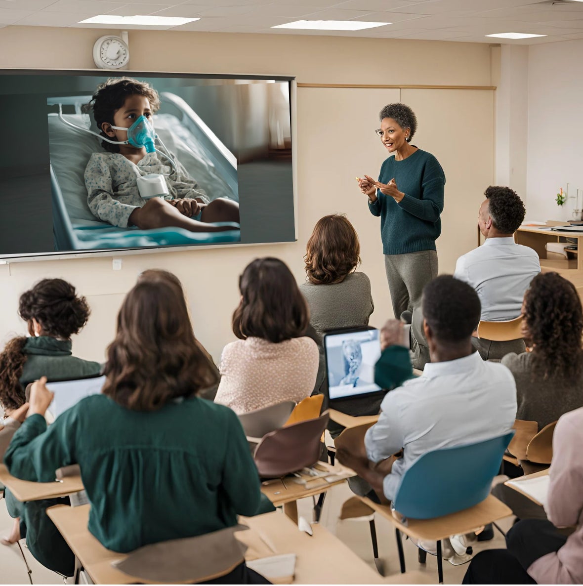 PEARSでは本物の患児の映像・モニター・音を用います。日本ではなかなかできないアメリカ発祥ならではのものです。実際に患児と対面し、アセスメントを行なっているものと、全く同じことが追体験できます。
