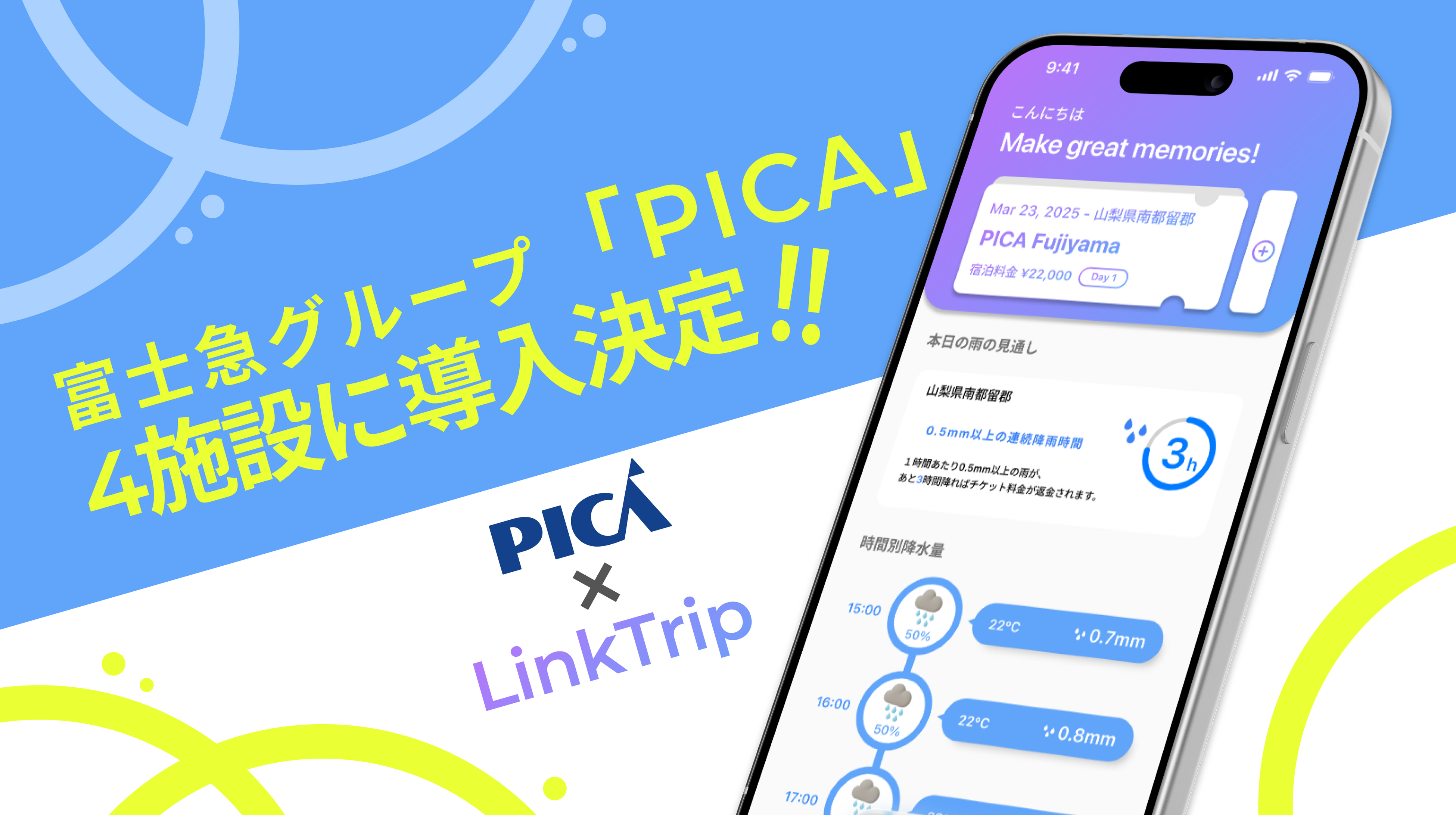 株式会社LinkTrip(本社:東京都渋谷区、社長:橋本啓佑)は、富士急行株式会社(東証プライム上場)のグループ会社である株式会社ピカ(以下「ピカ」)が運営するアウトドアリゾート「PICAリゾート」の4施設において、ジャパン少額短期保険株式会社との連携による「PICA 雨ふりHAPPY保証」を2026年4月より提供開始いたします。