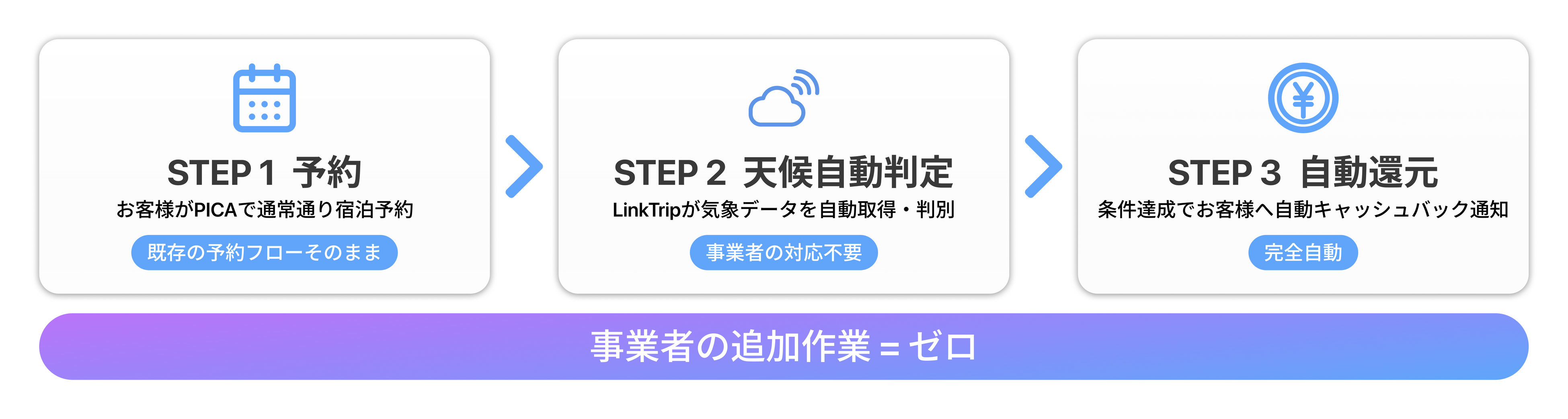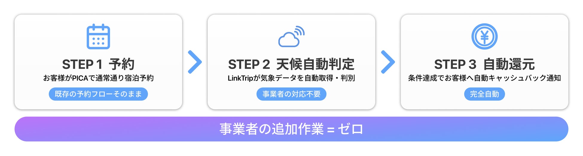 天候判定・キャッシュバック処理・精算まで一連の業務をLinkTripが担い、事業者は既存の予約フローを変えることなく導入できます。