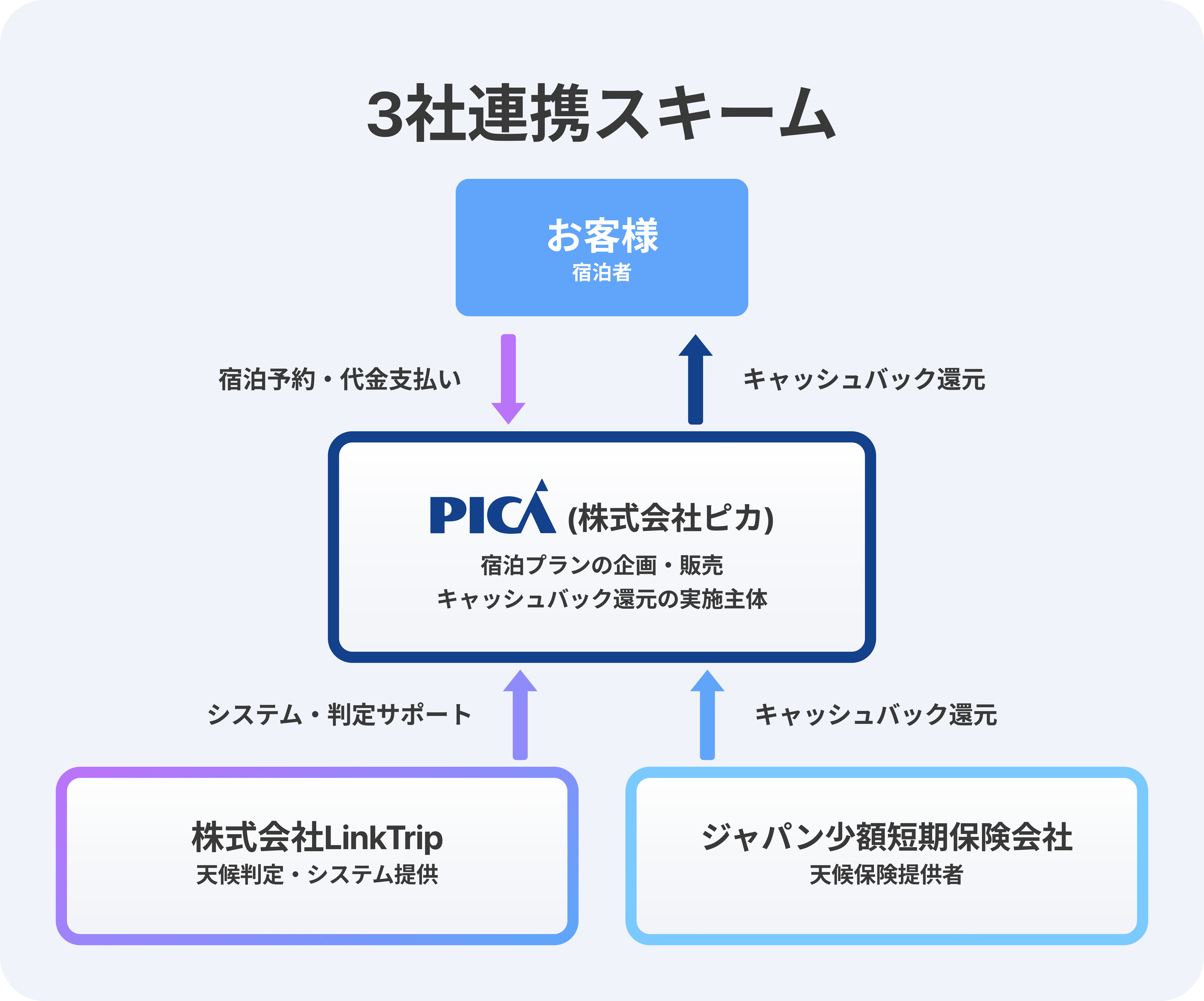 今回のPICAとの連携は、アウトドア宿泊施設への本格展開の第一号事例です。キャンプ・グランピングは「天気が全ての体験を左右する」業態であり、天候連動キャッシュバックの導入メリットが最大化される領域です。ピカが持つ国内トップクラスのアウトドアリゾート運営力と、LinkTripの独自システム、ジャパン少額短期保険の保険引受力を組み合わせることで、アウトドア業界に先駆けた新しい顧客体験モデルを構築します。