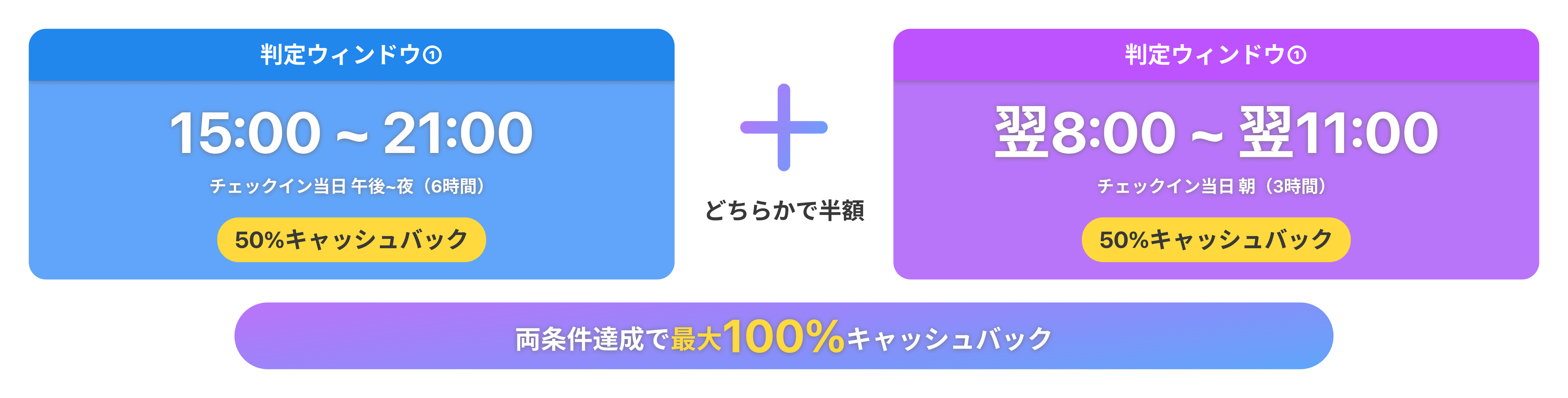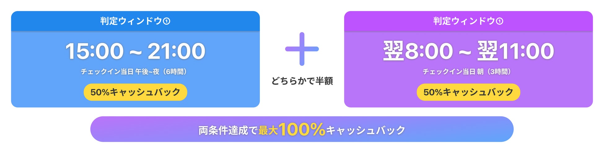宿泊当日の指定時間帯に一定以上の降水量が観測された場合、宿泊代金の最大100%をキャッシュバック |