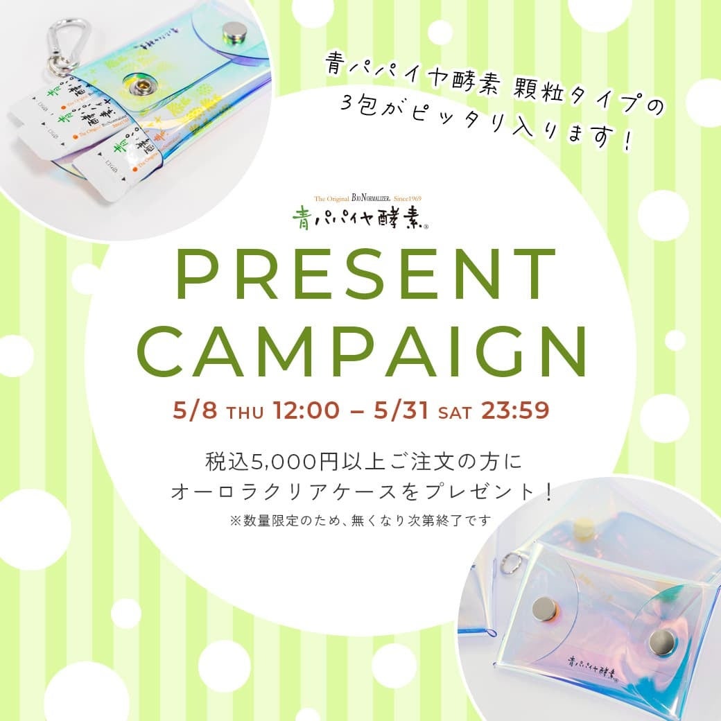 開催期間中、5,000円(税込)以上ご注文いただいた方に、青パパイヤ酵素オリジナル「オーロラクリアケース」をプレゼント!もちろん定期便商品も対象です。光の角度によって色が変化する、美しいオーロラカラーのクリアケース。大きく開くカラビナ付きで、携帯にも便利です。
