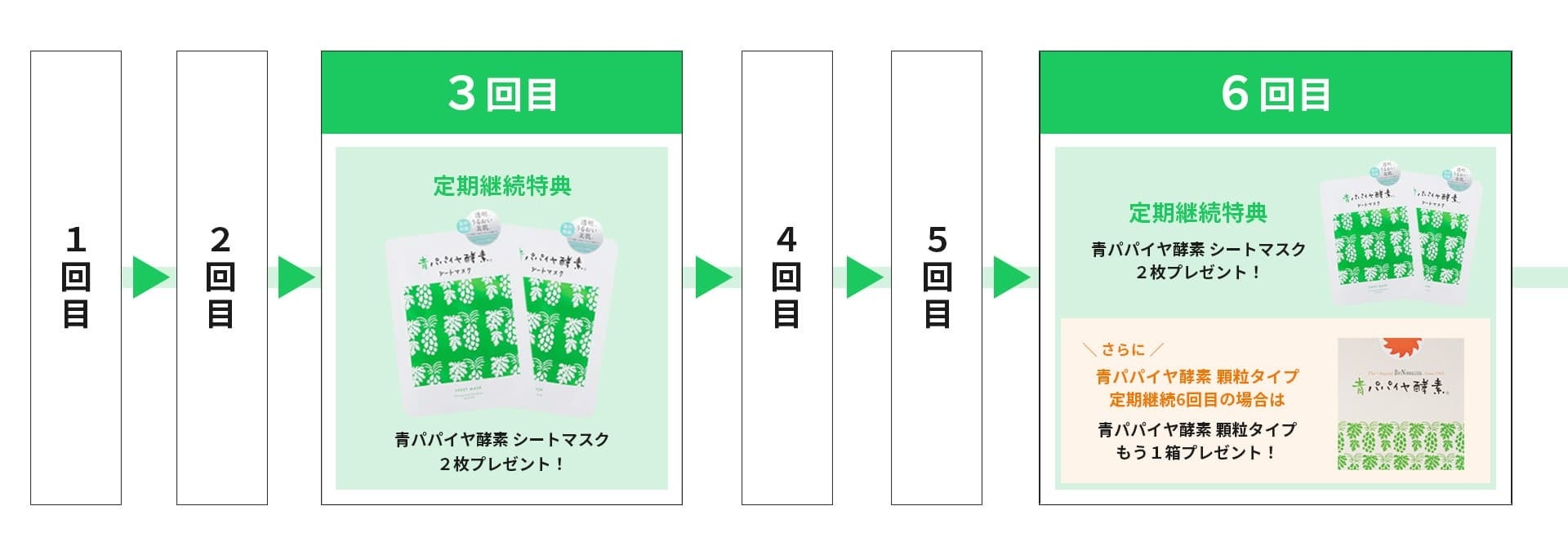 ・3回目と6回目の継続時に「青パパイヤ酵素 シートマスク(2枚)」をプレゼント