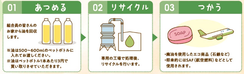 現在、日本では事業系の廃食油の約90%が回収されていますが、家庭から出る廃食油のほとんどはリサイクルされずに一般廃棄物として処理されており、その量は年間10万トンにも及ぶと推計されています。これらを有効に活用し、資源の循環およびCO2の排出量削減に寄与することを目的として、取り組みを開始します。