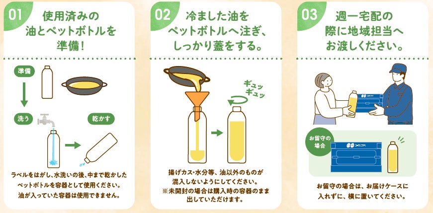 回収拠点へ廃食油を持参することがリサイクルを進めるうえでの障壁であるとの考えから、2025年1月から2つの宅配センターで実証実験を実施しました。4月末までに1813本、919.9kgを回収するとともに、多くの組合員から賛同のお声をいただいたため、2025年6月10日から全ての宅配センターでの回収を開始します。