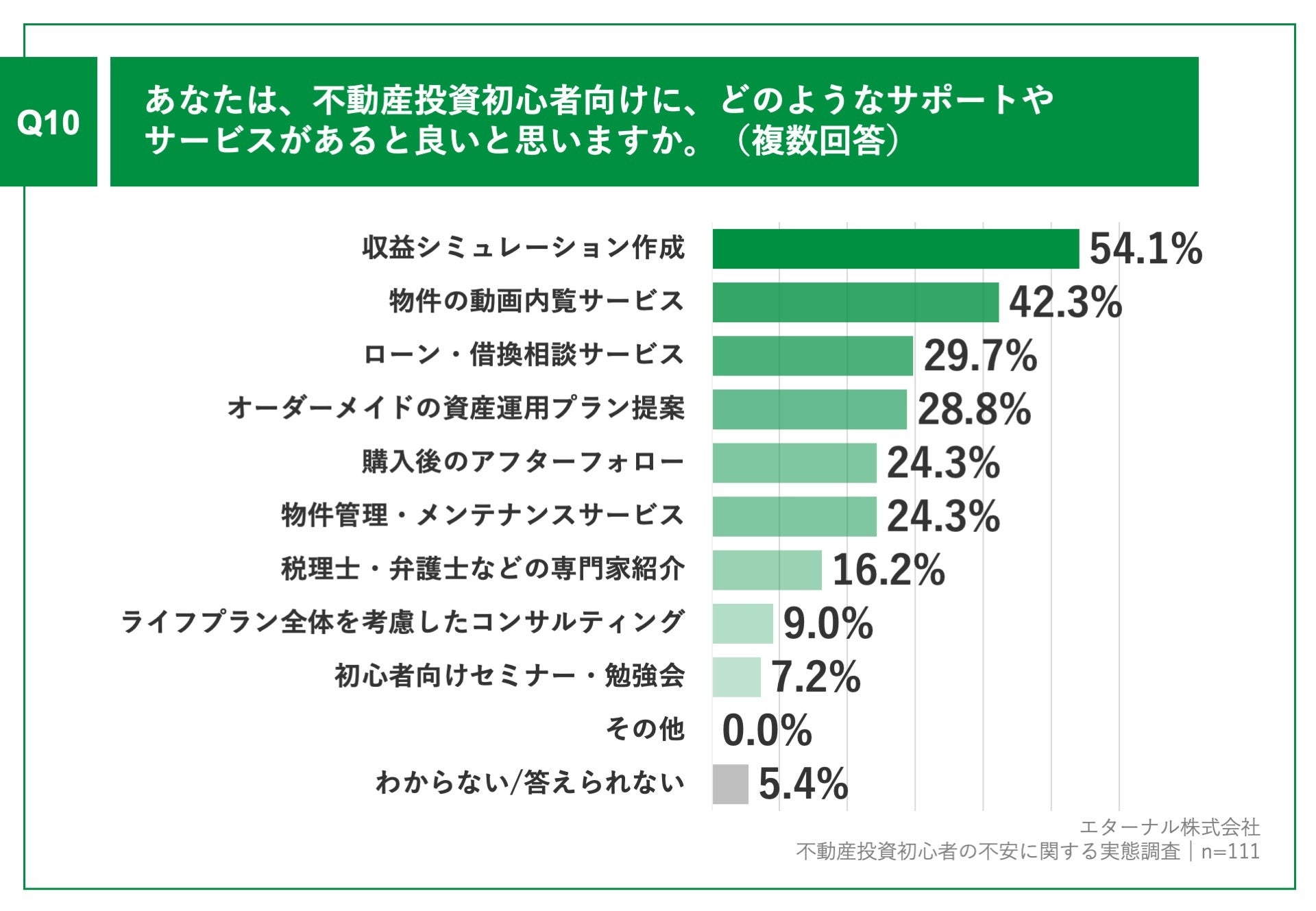 「Q10.あなたは、不動産投資初心者向けに、どのようなサポートやサービスがあると良いと思いますか。(複数回答)」(n=111)と質問したところ、「収益シミュレーション作成」が54.1%、「物件の動画内覧サービス」が42.3%、「ローン・借換相談サービス」が29.7%という回答となりました。