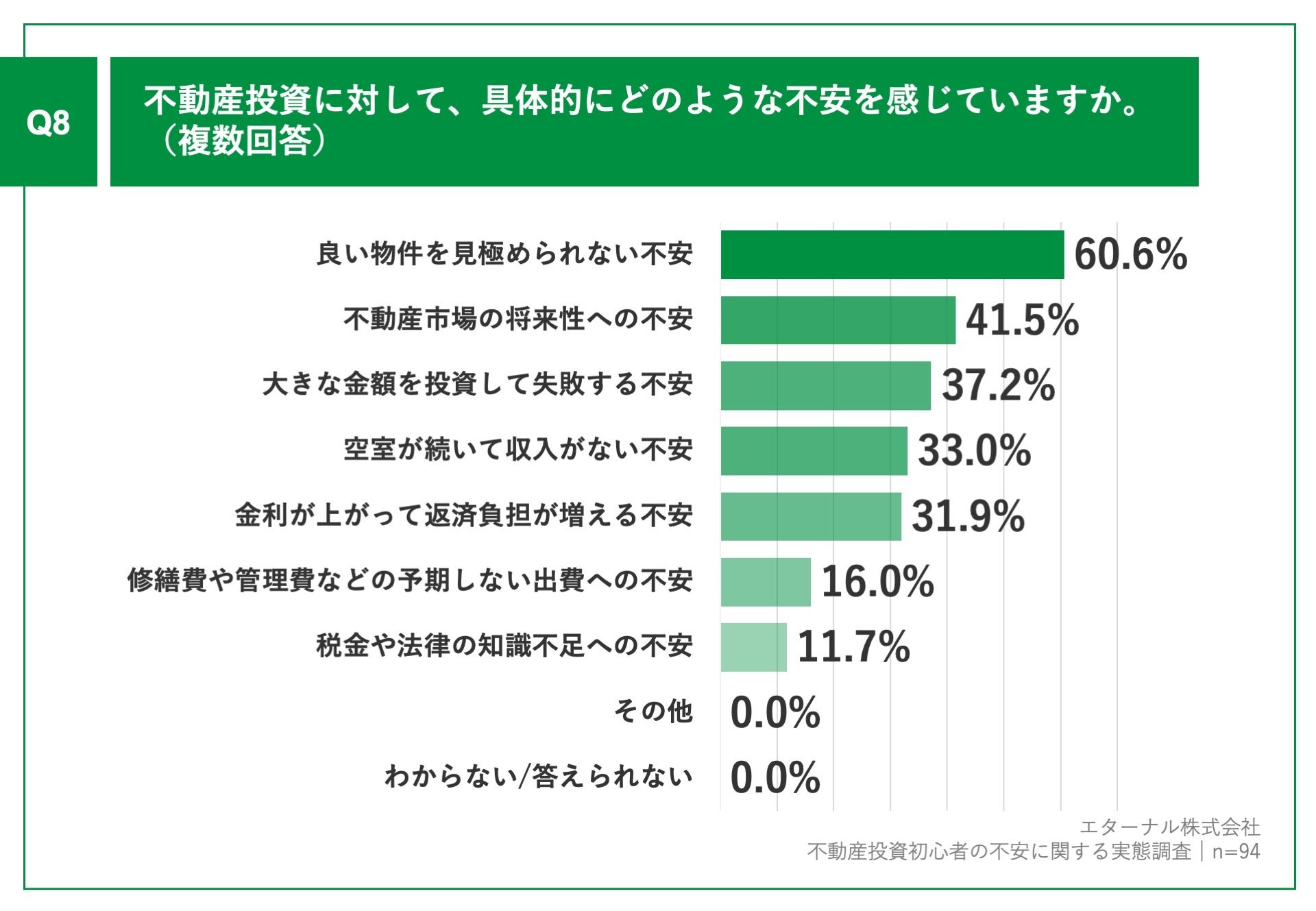 Q7で「かなり感じている」「やや感じている」と回答した方に、「Q8.不動産投資に対して、具体的にどのような不安を感じていますか。(複数回答)」(n=94)と質問したところ、「良い物件を見極められない不安」が60.6%、「不動産市場の将来性への不安」が41.5%、「大きな金額を投資して失敗する不安」が37.2%という回答となりました。