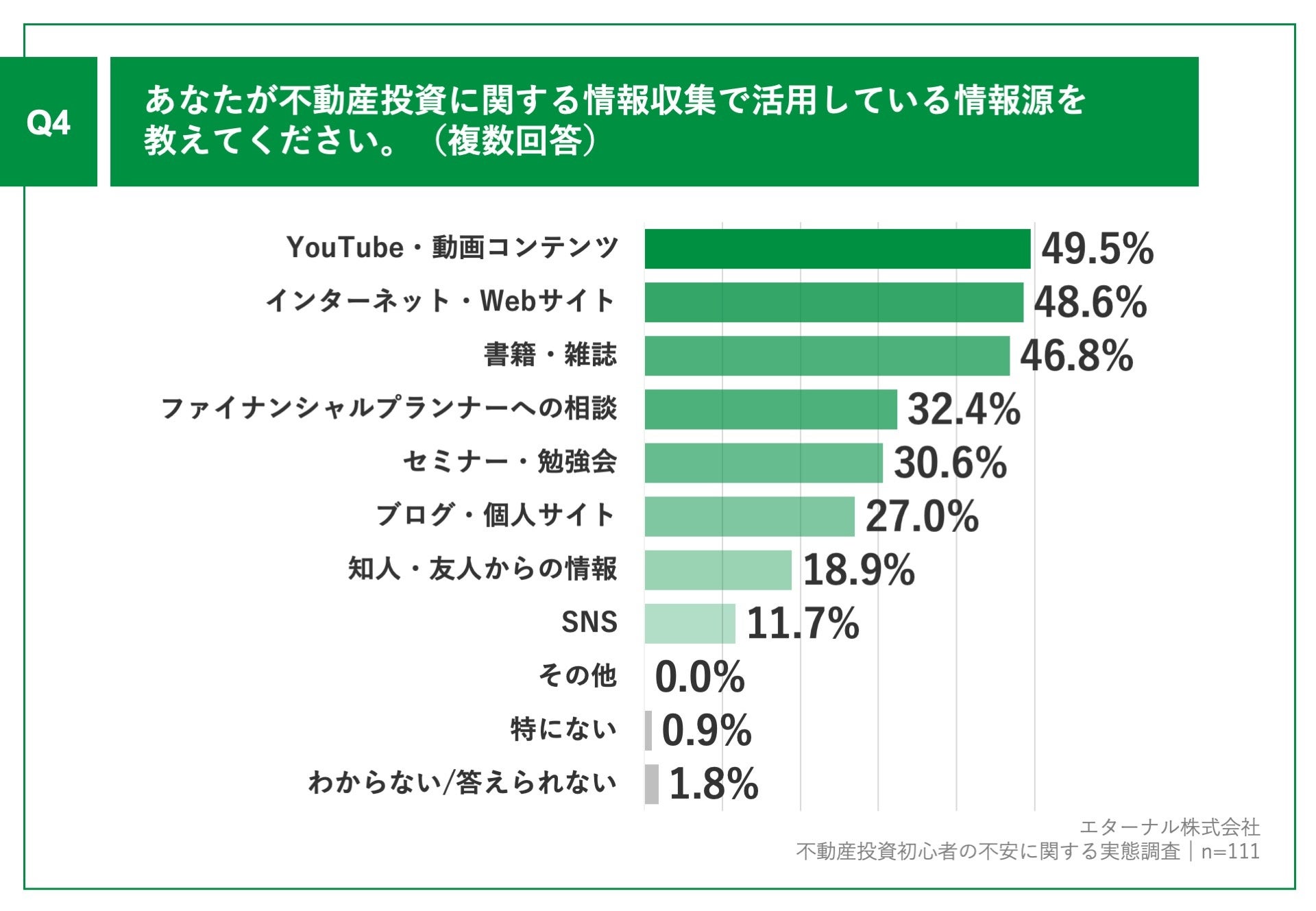 「Q4.あなたが不動産投資に関する情報収集で活用している情報源を教えてください。(複数回答)」(n=111)と質問したところ、「YouTube・動画コンテンツ」が49.5%、「インターネット・Webサイト」が48.6%、「書籍・雑誌」が46.8%という回答となりました。