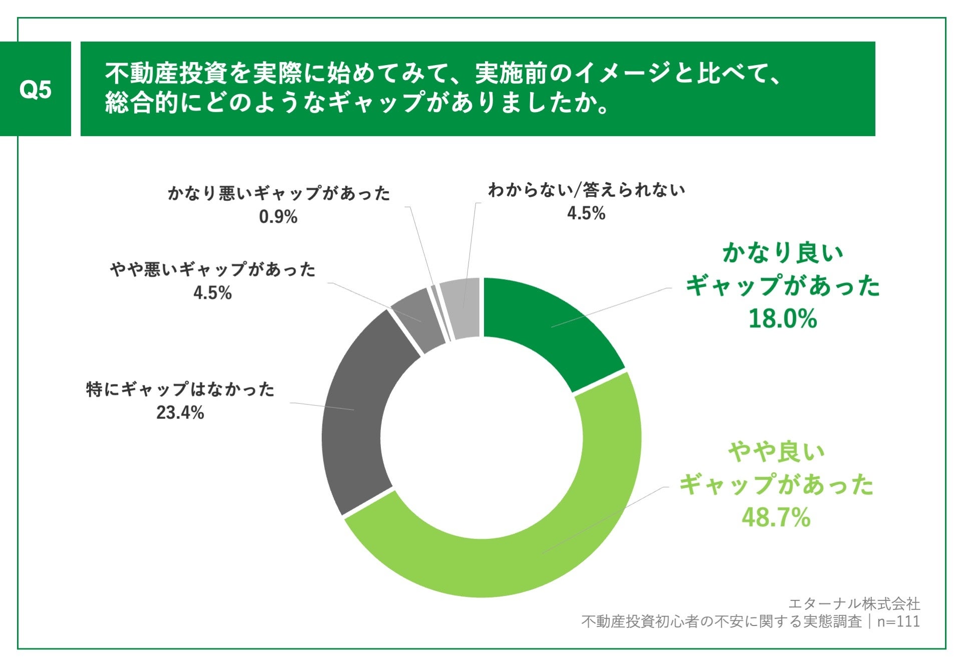 「Q5.不動産投資を実際に始めてみて、実施前のイメージと比べて、総合的にどのようなギャップがありましたか。」(n=111)と質問したところ、「かなり良いギャップがあった」が18.0%、「やや良いギャップがあった」が48.7%という回答となりました。