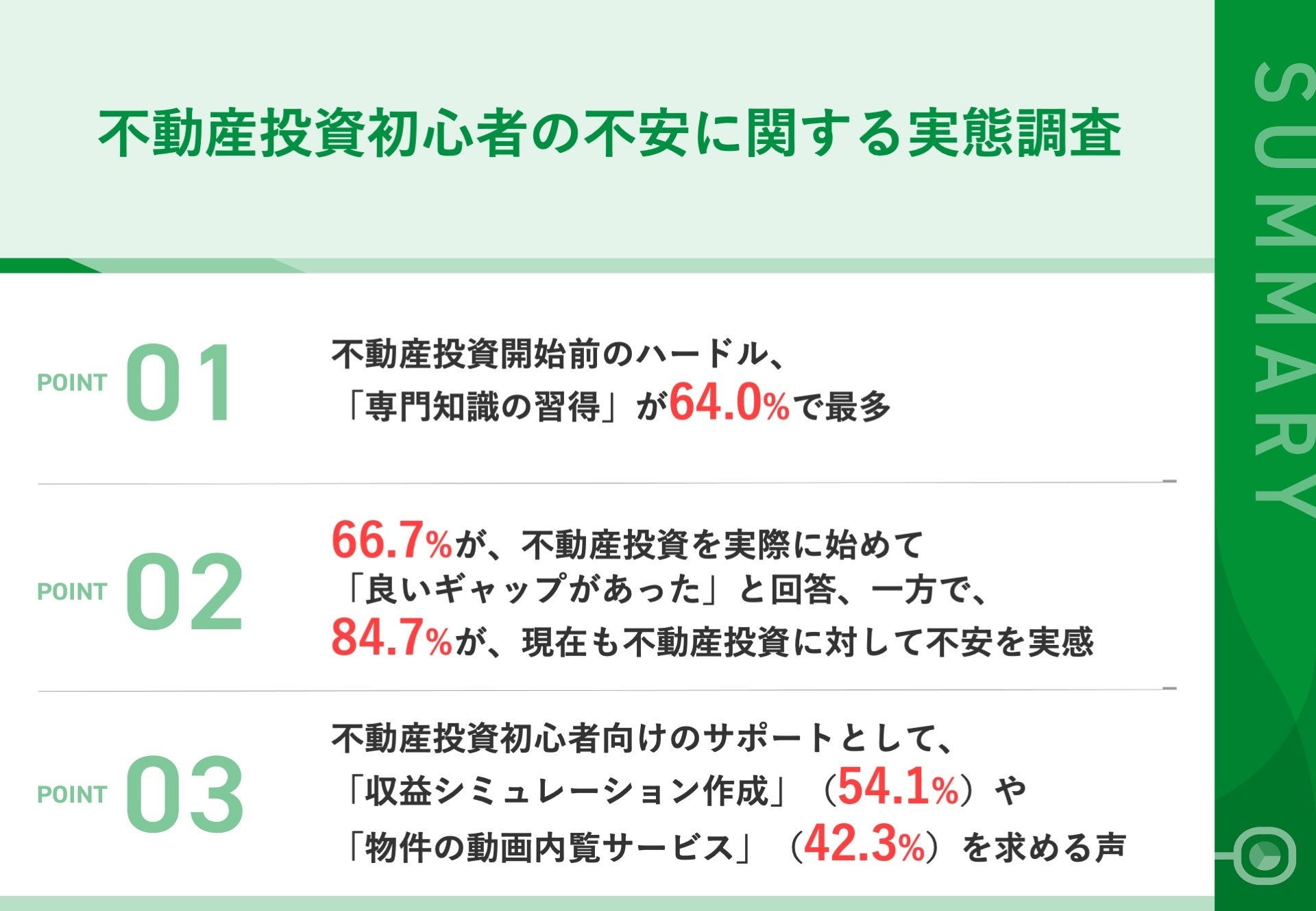 まず、不動産投資開始前のハードルとしては、「専門知識の習得」が64.0%で最も多く、安心して不動産投資を進めるために欲しかった情報では、「地域の将来性に関する情報」(63.8%)や「不動産投資のリスクと対策」(45.7%)が上位になりました。また、66.7%が、不動産投資を実際に始めて「良いギャップがあった」と回答し、うち70.3%が「想定よりも物件の資産価値が上昇した」ことを挙げています。一方で、84.7%が、現在も不動産投資に対して不安を抱えており、「良い物件を見極められない不安」(60.6%)や「不動産市場の将来性への不安」(41.5%)を感じていることがわかりました。最後に、不動産投資初心者向けのサポートとしては、「収益シミュレーション作成」(54.1%)や「物件の動画内覧サービス」(42.3%)が求められています。