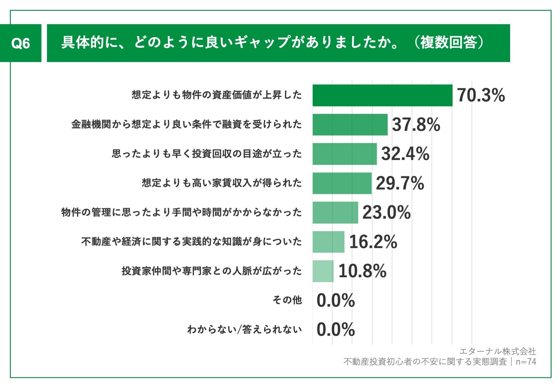 Q5で「かなり良いギャップがあった」「やや良いギャップがあった」と回答した方に、「Q6.具体的に、どのように良いギャップがありましたか。(複数回答)」(n=74)と質問したところ、「想定よりも物件の資産価値が上昇した」が70.3%、「金融機関から想定より良い条件で融資を受けられた」が37.8%、「思ったよりも早く投資回収の目途が立った」が32.4%という回答となりました。
