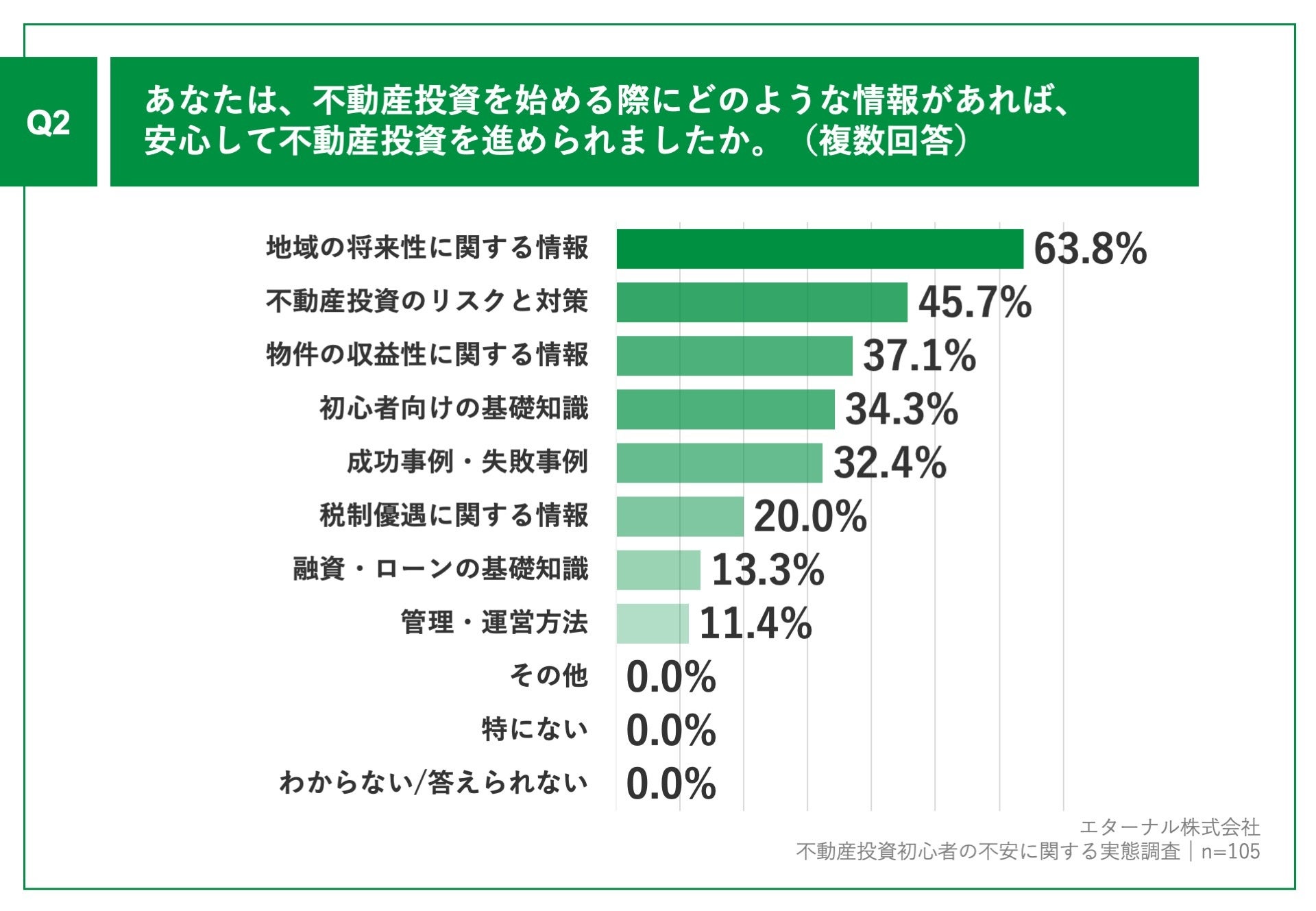 Q1で「特にない」「わからない/答えられない」以外を回答した方に、「Q2.あなたは、不動産投資を始める際にどのような情報があれば、安心して不動産投資を進められましたか。(複数回答)」(n=105)と質問したところ、「地域の将来性に関する情報」が63.8%、「不動産投資のリスクと対策」が45.7%、「物件の収益性に関する情報」が37.1%という回答となりました。