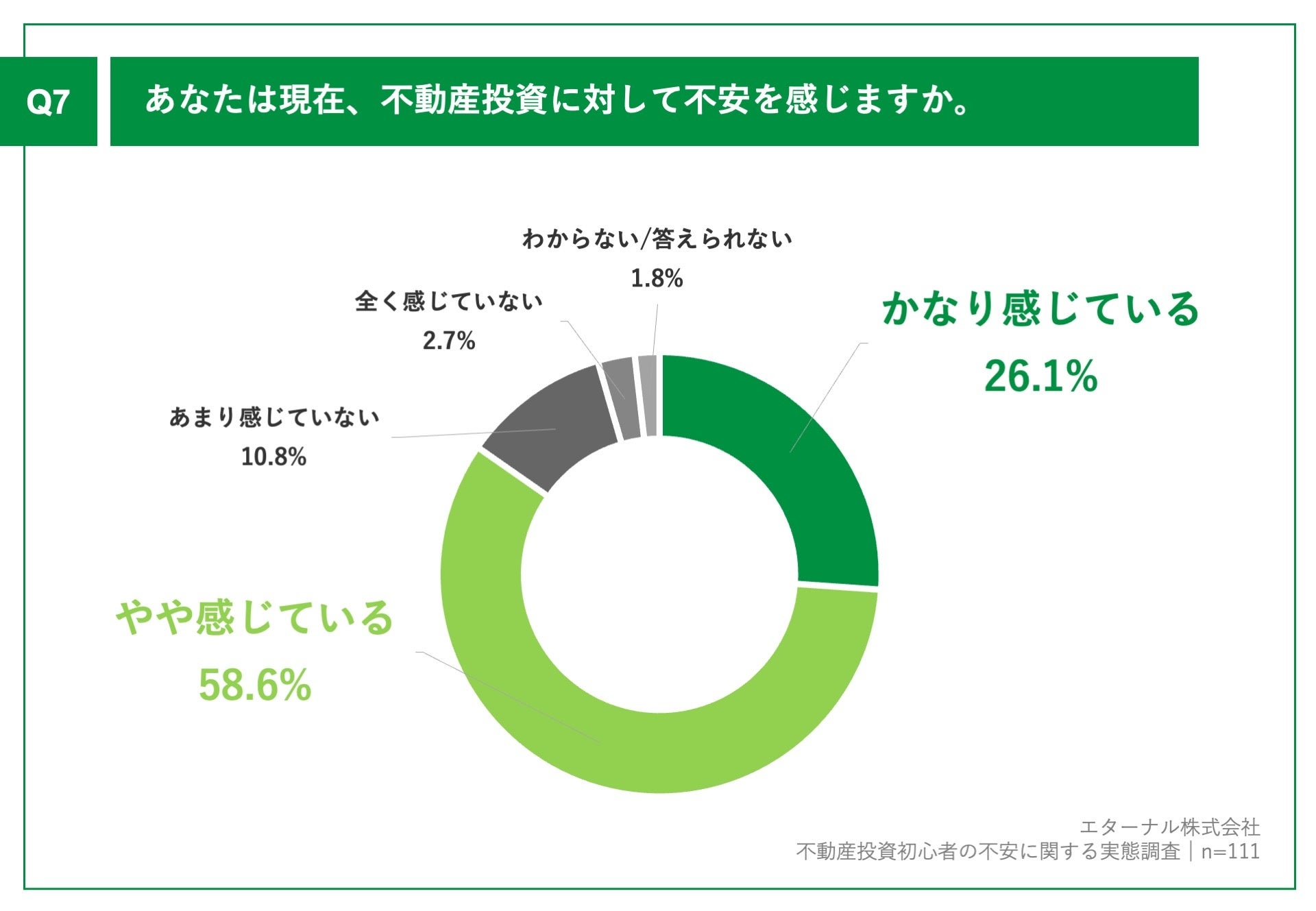「Q7.あなたは現在、不動産投資に対して不安を感じますか。」(n=111)と質問したところ、「かなり感じている」が26.1%、「やや感じている」が58.6%という回答となりました。