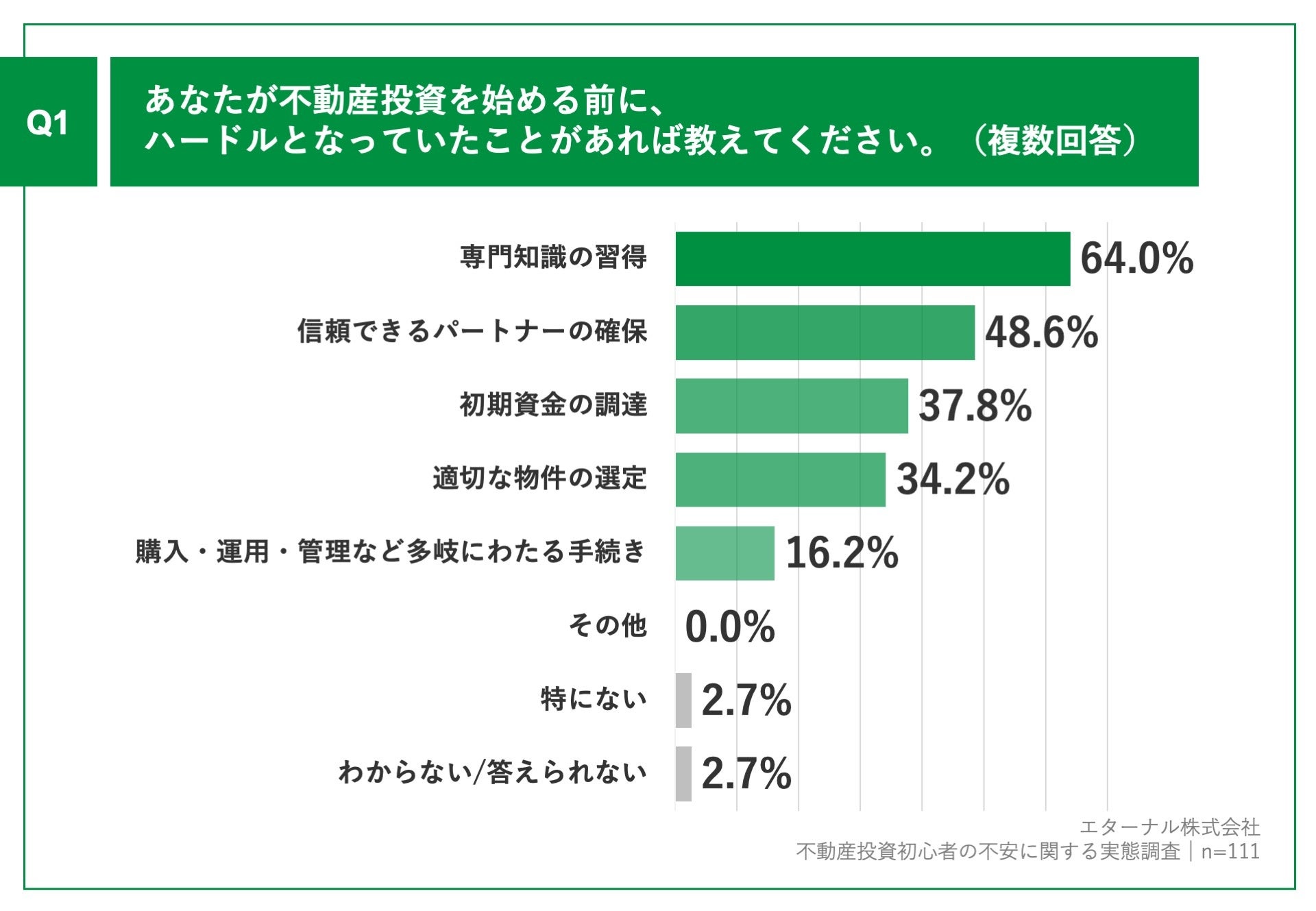 「Q1.あなたが不動産投資を始める前に、ハードルとなっていたことがあれば教えてください。(複数回答)」(n=111)と質問したところ、「専門知識の習得」が64.0%、「信頼できるパートナーの確保」が48.6%、「初期資金の調達」が37.8%という回答となりました。