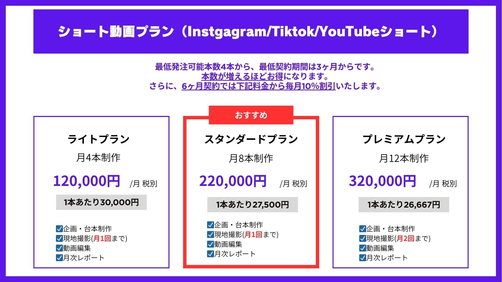 新プランには3つのメニューを用意しており、全て企画・撮影・編集・月次レポートを含み、1本3万円以下でご提供しております。