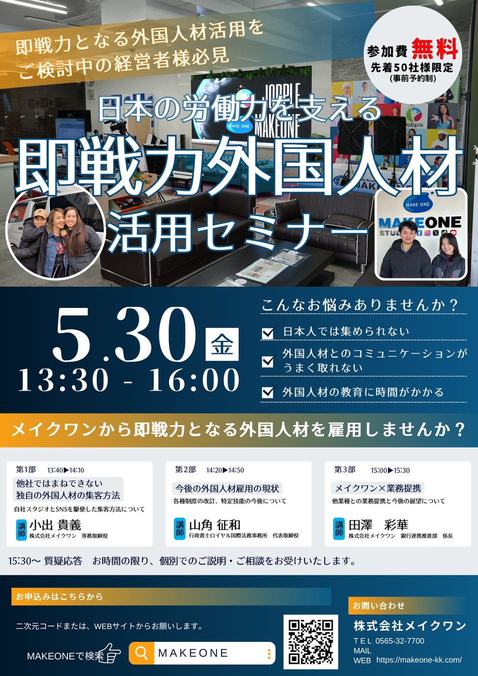 人材不足解消に向けて、新たなステップを踏み出しませんか?外国人材雇用の最新動向や、独自の集客方法、さらにあいち銀行様との業務提携のメリットについて、業界の第一線で活躍する講師が直接お伝えする貴重なセミナーです。