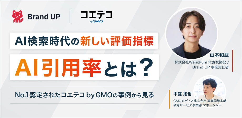 そこでBrand UPとGMOメディアが展開するコエテコ byGMOは、2026年5月20日(水)に共催ウェビナーを開催します。本ウェビナーでは、LLMO対策ツールを提供するBrand UPが2026年2月に実施した「AI Search Cited Award 2026 上期」の調査データをもとに、AIに引用されるメディアの特徴と次の時代の新指標「AI引用率」についてお伝えします。
