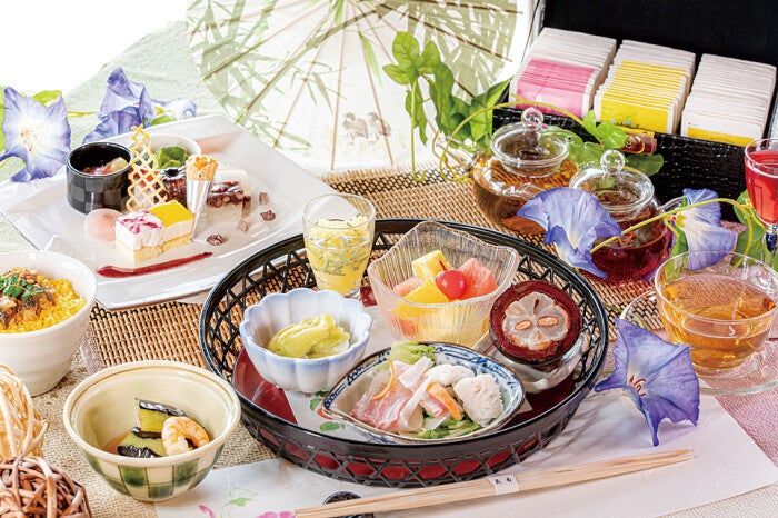 奈良ホテルの日本料理「花菊」で、9月15日(月)までの期間限定で開催されている、ランチ代わりになるアフタヌーンティー。和食店ならではの和の素材を使用した食事メニューと夏らしい涼やかなスイーツをそろえた内容に。神戸の紅茶ブランド「Lakshimi」の極上はちみつ紅茶5種と和紅茶、コーヒーもラインナップ。和の落ち着いた店内で、優雅なランチタイムをお過ごしください。1人6500円(税サ込)。