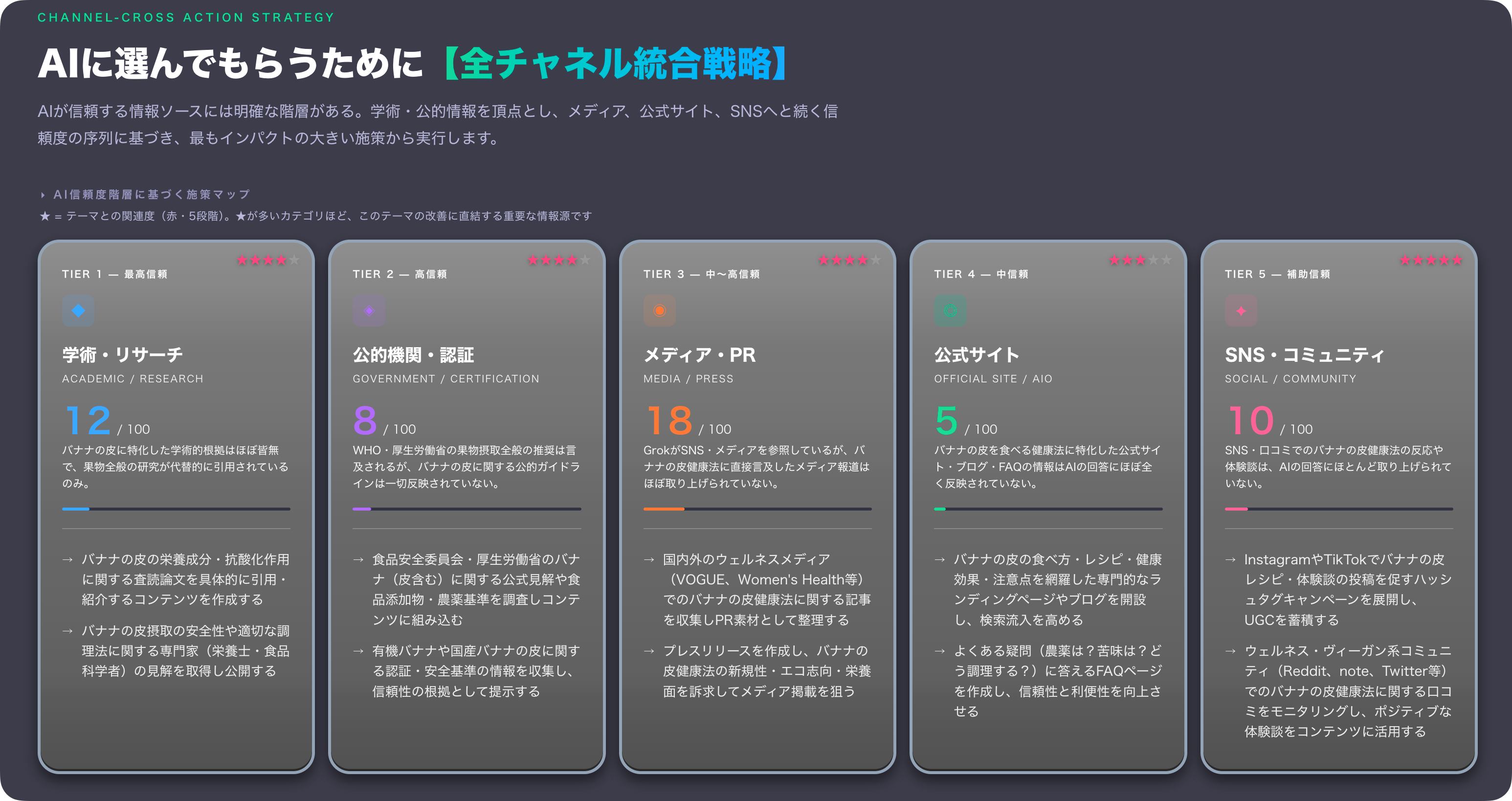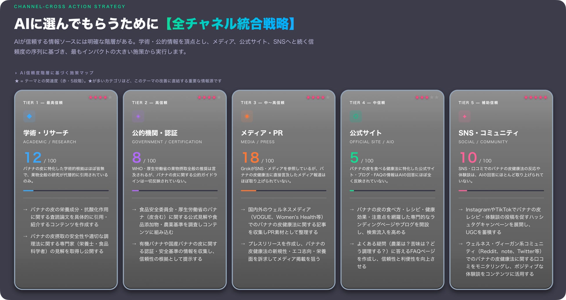 AIが情報を信頼する度合いには階層があります。学術論文や公的機関の情報は最も信頼され、SNSの投稿は内容次第です。この「信頼度階層」に基づいて、5つのTierごとに具体的なアクションプランを提案します。