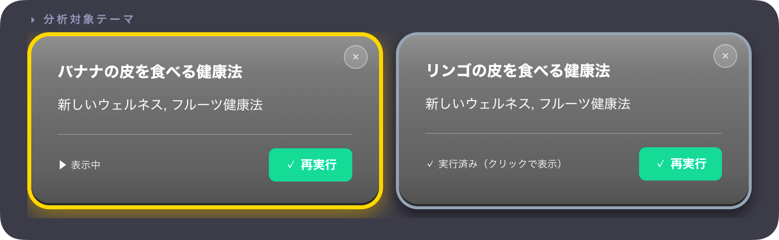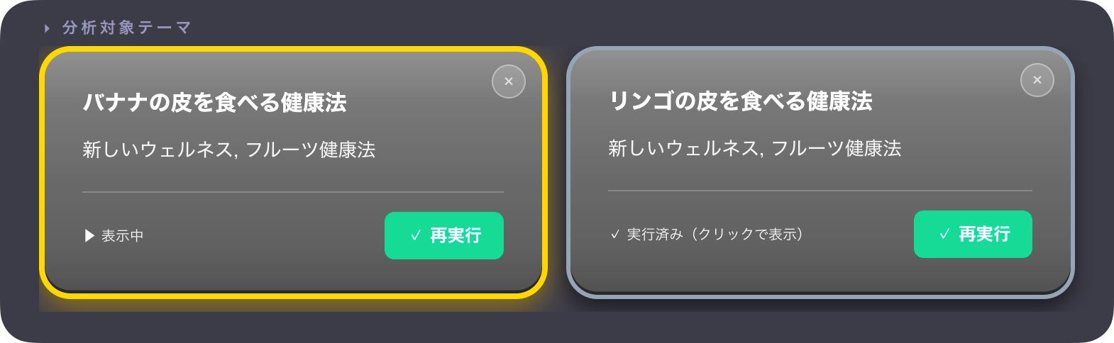分析済みのテーマはすべてカードとして保存できるので、定点観測にも最適。月次で競合との差分を追い続けることで、AI認知度の改善効果を定量的に実証できます。