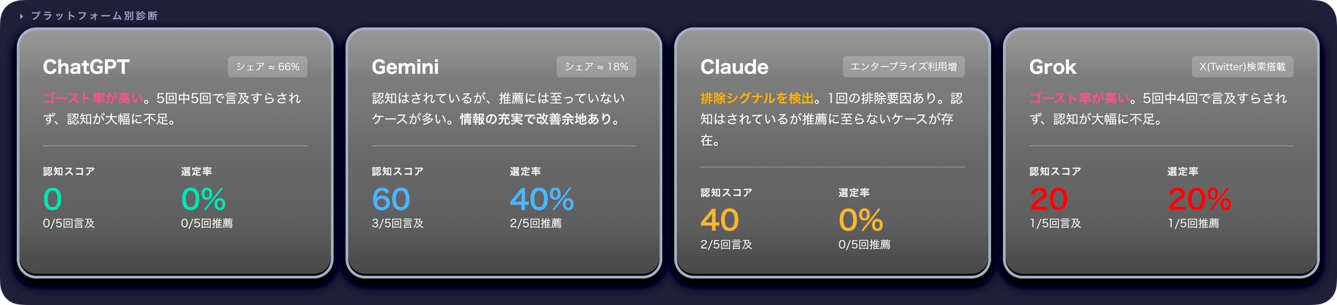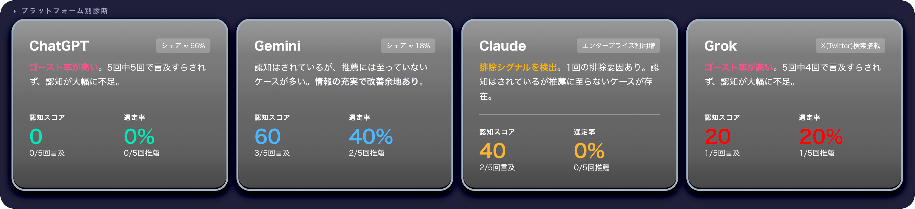AIプラットフォームごとに認知のされ方は異なります。ChatGPTでは推薦されるのに、Geminiでは存在すら知られていない──そんなケースは珍しくありません。