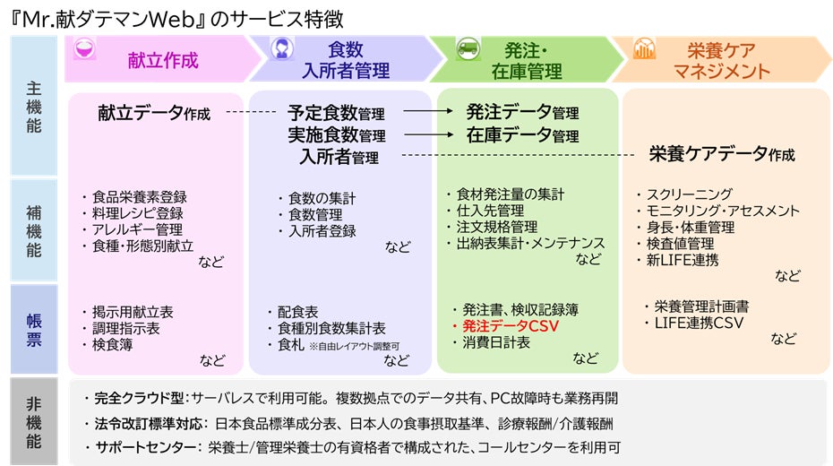 『Mr.献ダテマンWeb』は、社会福祉施設、児童福祉施設、医療機関などで給食を提供する栄養士/管理栄養士の皆さまの業務を支援するSaaS型サービスです。このたび当社は、栄養・給食管理ソフト『Mr.献ダテマンWeb』から出力される発注データCSVについて、「クロスオーダー給食」へ取り込み可能な様式を標準搭載しました。