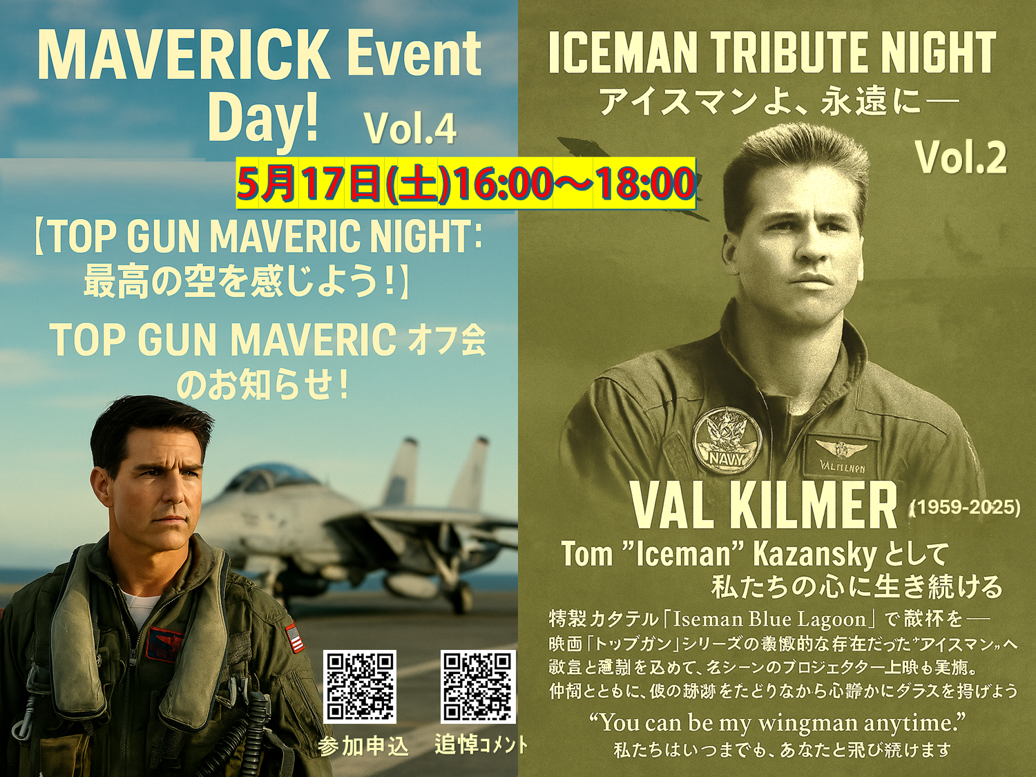 映画『TOP GUN MAVERICK』の熱狂冷めやらぬ中、神奈川県・江ノ島のCafe&Bar MAVERICKにて、5月17日(土)に「アイスマン追悼×TOP GUNオフ会」のハイブリッドイベントが開催決定。前回、全国から集まったファンの声に応え、今回は"話し足りなかった人"と"来られなかった人"のために再演。大スクリーンでの映像上映や全員合唱、マニアックトークにクイズ企画まで、熱すぎる時間が再び始まる。
