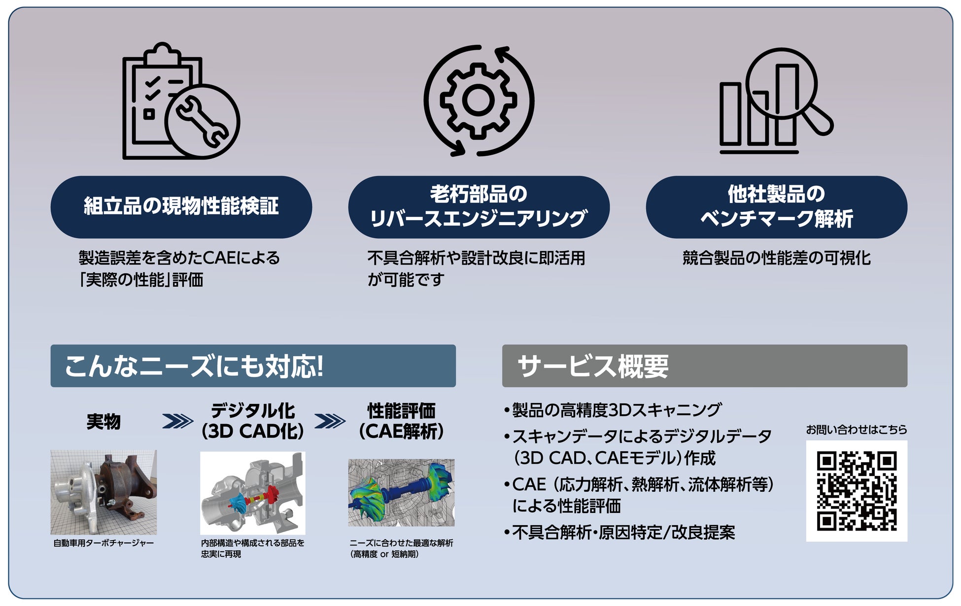 X線CTスキャン×CAE解析による革新的な性能評価サービスです。リバースエンジニアリングやベンチマーク解析をはじめ、製品内部の欠陥の可視化、不具合の原因特定などに役立てていただけます。