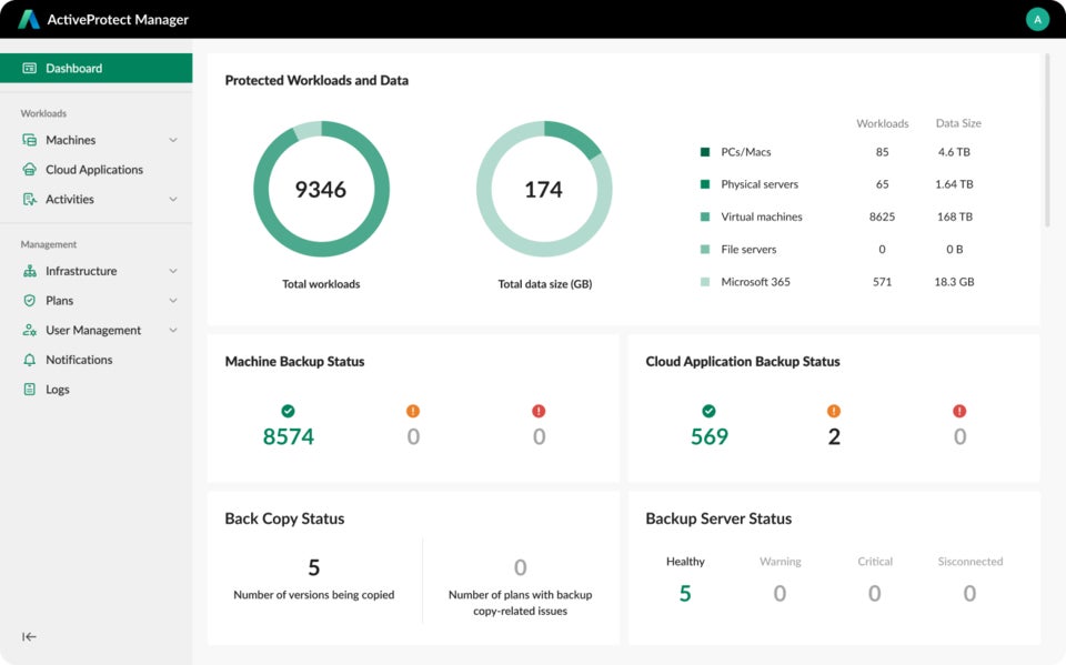 データの可視性:単一の画面からバックアップインフラストラクチャ全体のあらゆるバックアップ、バックアップコピー、アーカイブデータを含む最大150,000のワークロードを統合して表示し、2,500の拠点を監視できます。