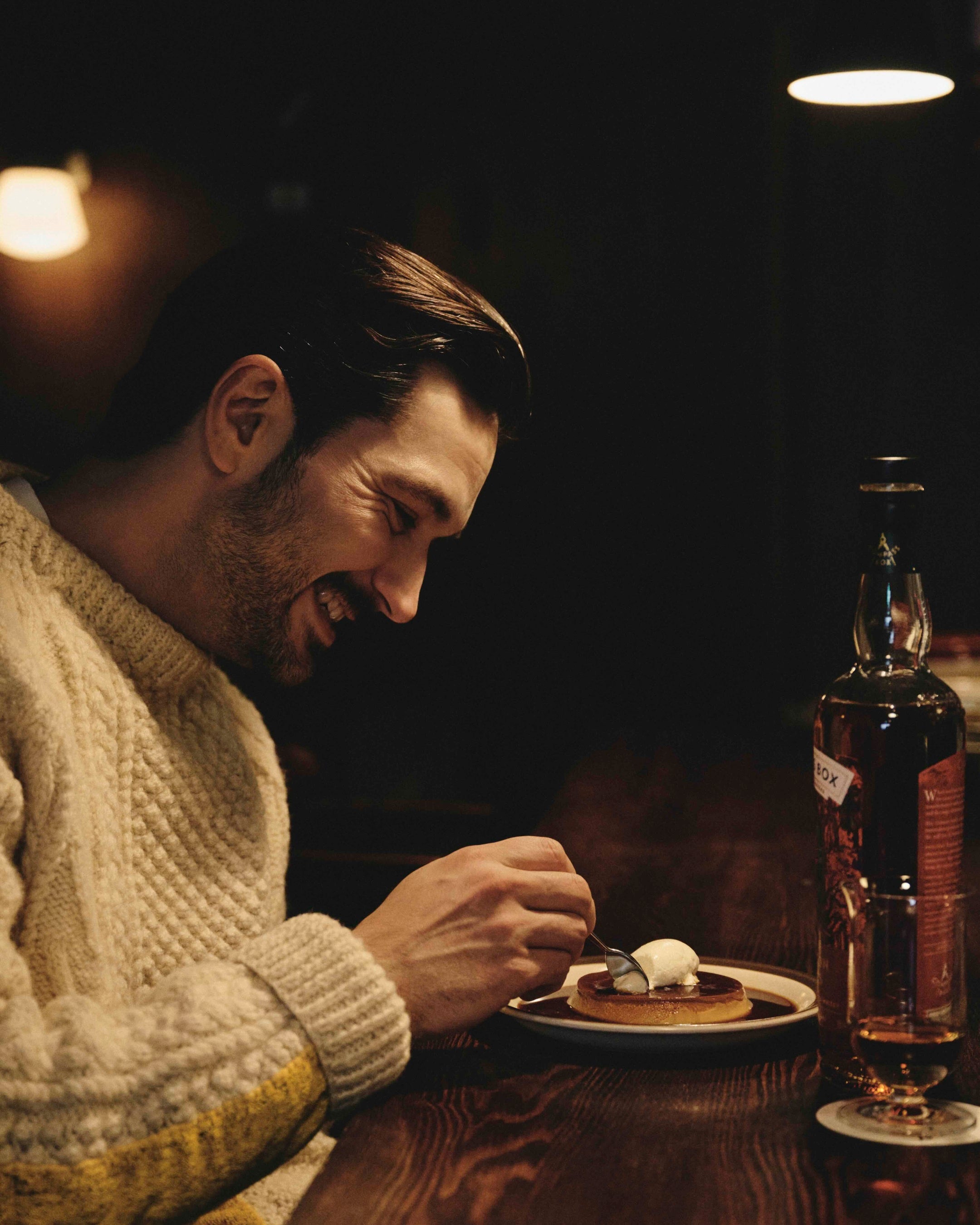 河原町近くにオープンしたバー。落ち着いた照明のもと、酒と軽いアテ、デザートまで楽しめる一軒だ。本企画では〈クリムゾン カスク〉をストレートで提案。自家製「森田倶楽部のプリン」に少量垂らして合わせることで、甘さの奥に潜んでいたスパイスが立ち上がる。デザートでありながら輪郭はぶれず、酒を添えることで完成度が引き上げられる、夜の終わりにふさわしいペアリングだ。