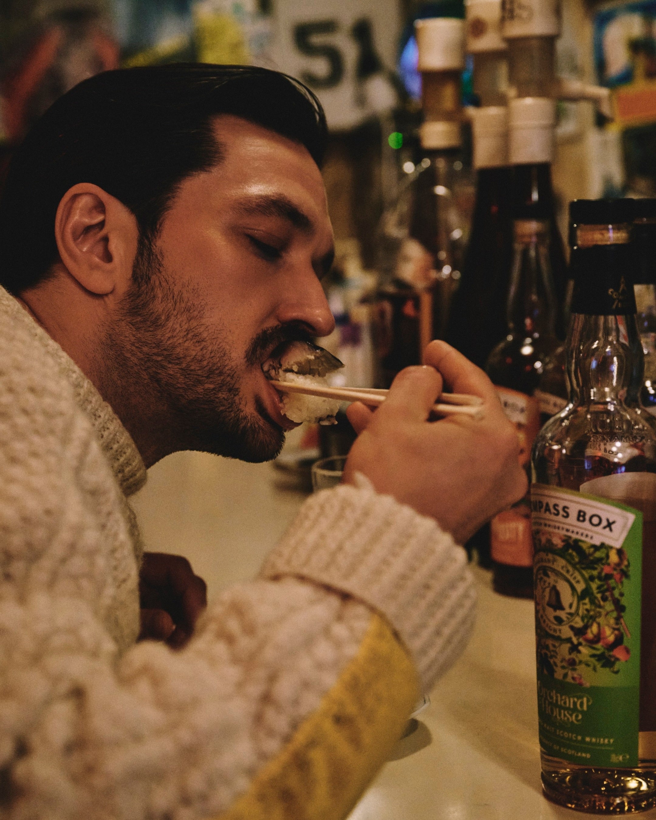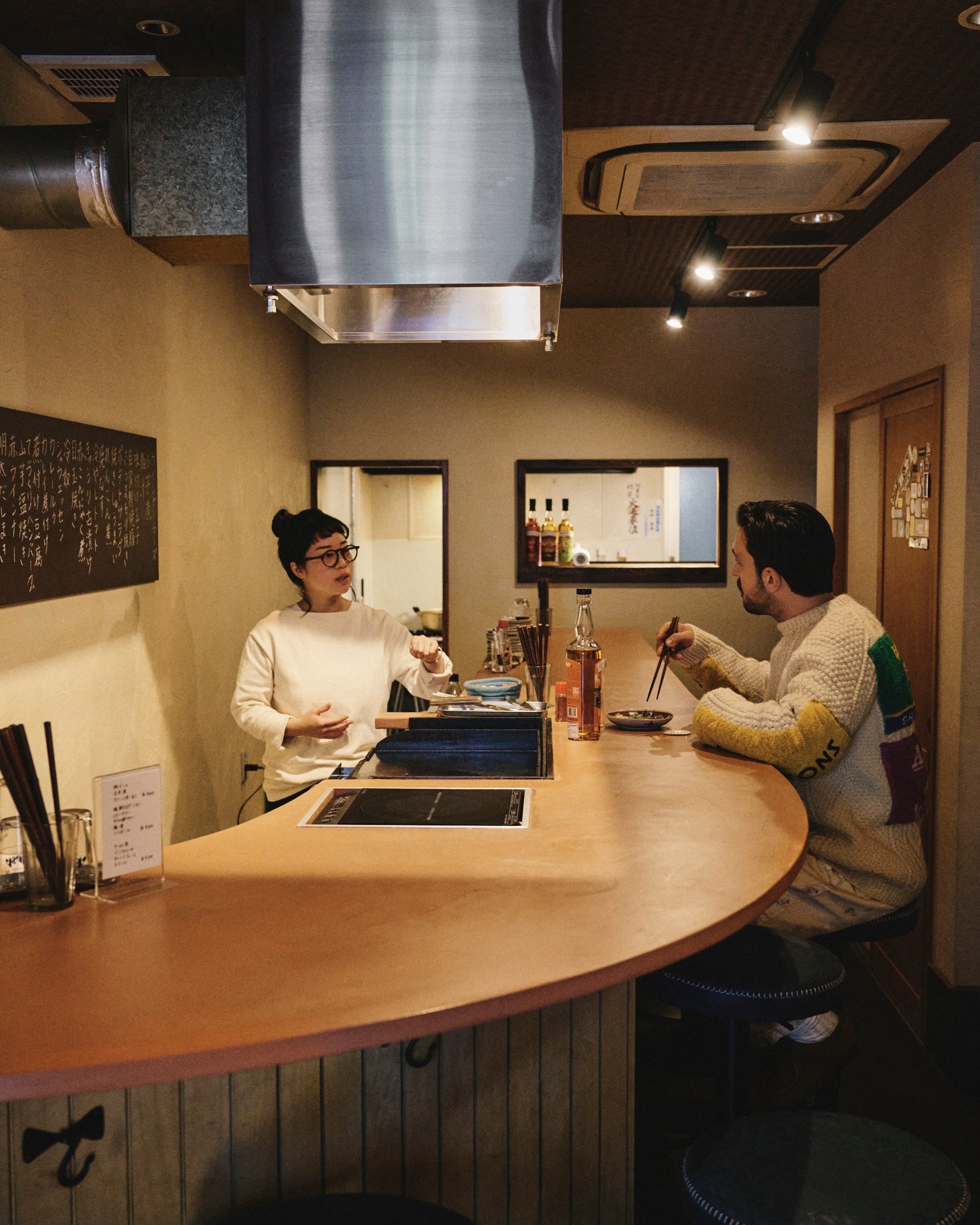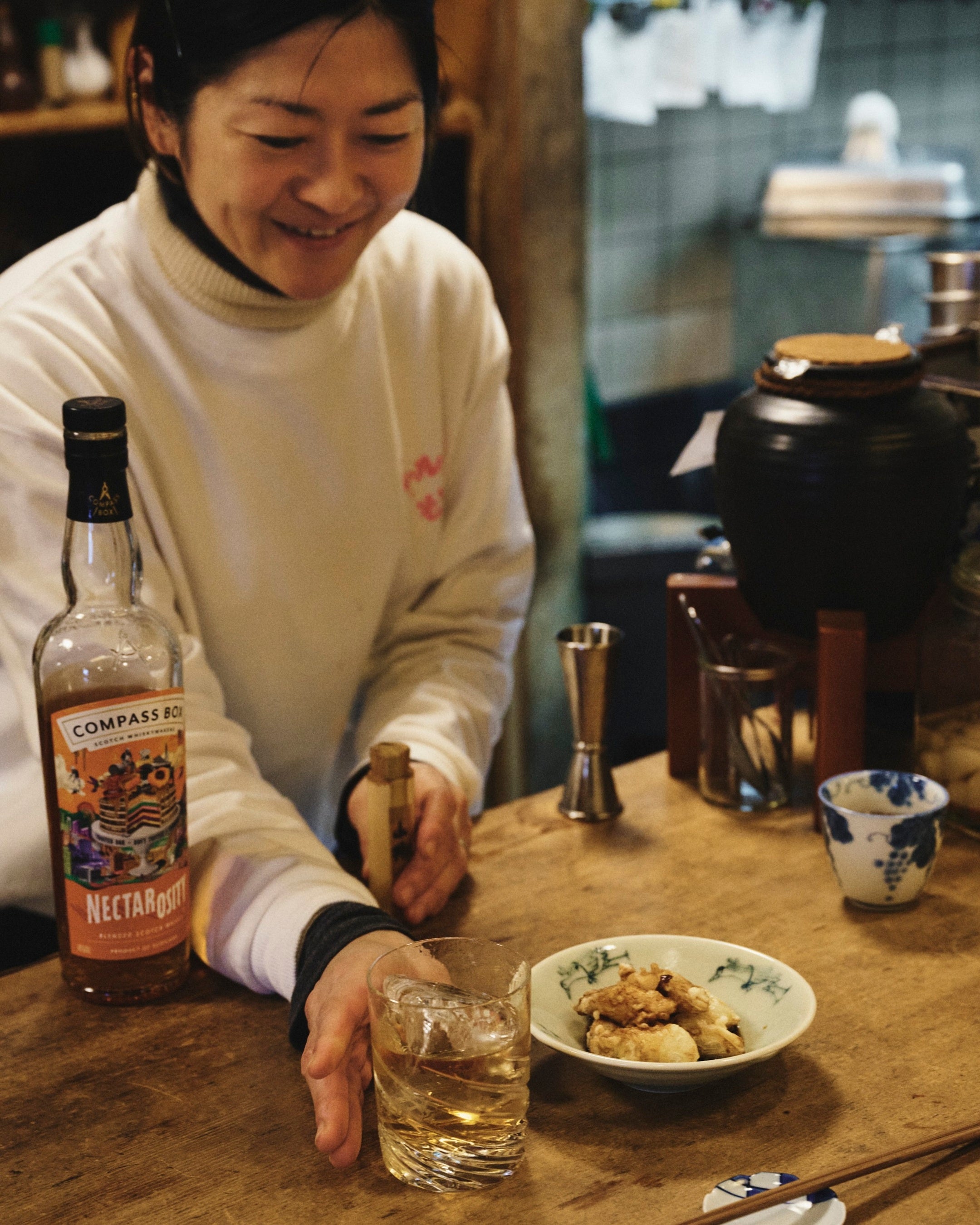 京都・一乗寺で1973年に創業。三兄妹が受け継ぐ蕎麦屋で、酒と蕎麦前の時間が静かに積み重ねられてきた。本企画では、コンパス ボックスの〈ネクタロシティ〉をオン・ザ・ロックで提案。合わせるのは、名物の「葱の天ぷら」。出汁と葱の甘みを受け止め、途中で山椒を加えることで香りが引き締まる。一杯で完結するのではなく、食事の流れに寄り添いながら役割を変えていく酒が、蕎麦前という時間を心地よく支えている。
