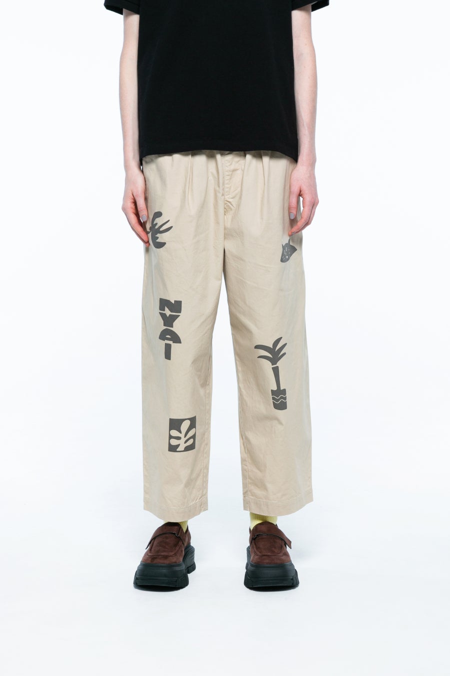 アナログとデジタルを横断するハイブリッドな制作スタイルで、有機的な形態をモチーフにしたグラフィック作品を手掛けるtaiki kishimoto。本コラボレーションでは、彼のアートワークの中に組み込まれたNYA-の存在にも注目です。プランツやコーヒーなどの身近なモチーフを、彼ならではの感覚で平面的なフォルムに落とし込んだアートワークは、Tシャツ、開襟シャツ、カバーオール、パンツ、スウェットとアパレルを始め、ラグや帽子、バッグなどの小物まで幅広く展開。taiki kishimotoによるNYA-の刺繍がワンポイントとしてあしらわれています。taiki kishimotoとNYA-が描く、リラックス感と独特のユーモア。心が躍るラインナップを、ぜひお楽しみください。
