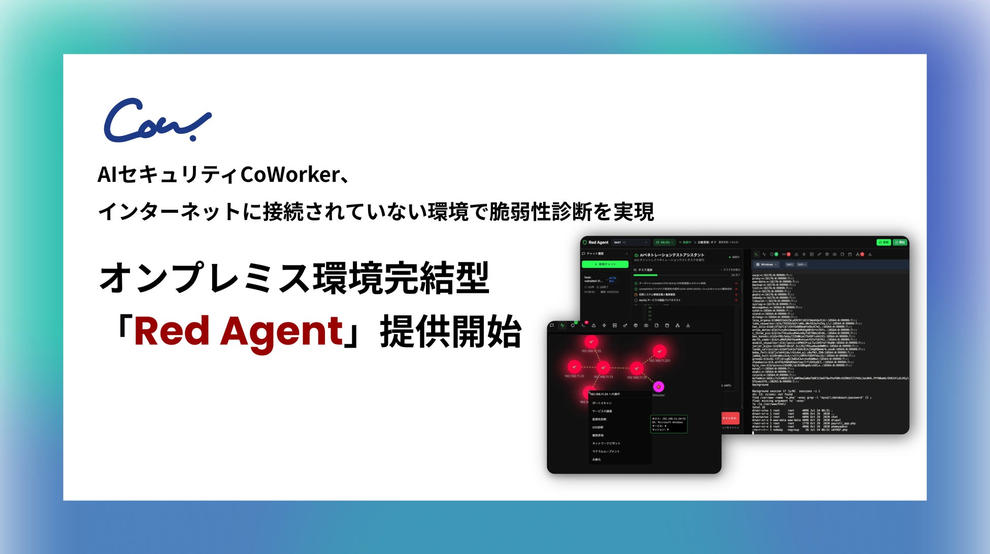 AIセキュリティソリューションを開発・提供するCoWorker株式会社(本社:東京都新宿区、代表取締役:山里一輝、以下「当社」もしくは「CoWorker」)は、自社開発の「Red Agent」のインターネット接続がされていない“オンプレミス環境版”の提供を2025年12月より開始することをお知らせいたします。