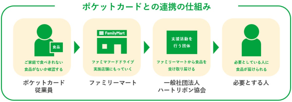 この度、ポケットカード様からお声がけいただき、「ファミマフードドライブ」の取り組みを協同で進めることとなりました。食支援の充実と食品ロス削減に関する新たな連携を実現できたことを大変嬉しく思います。