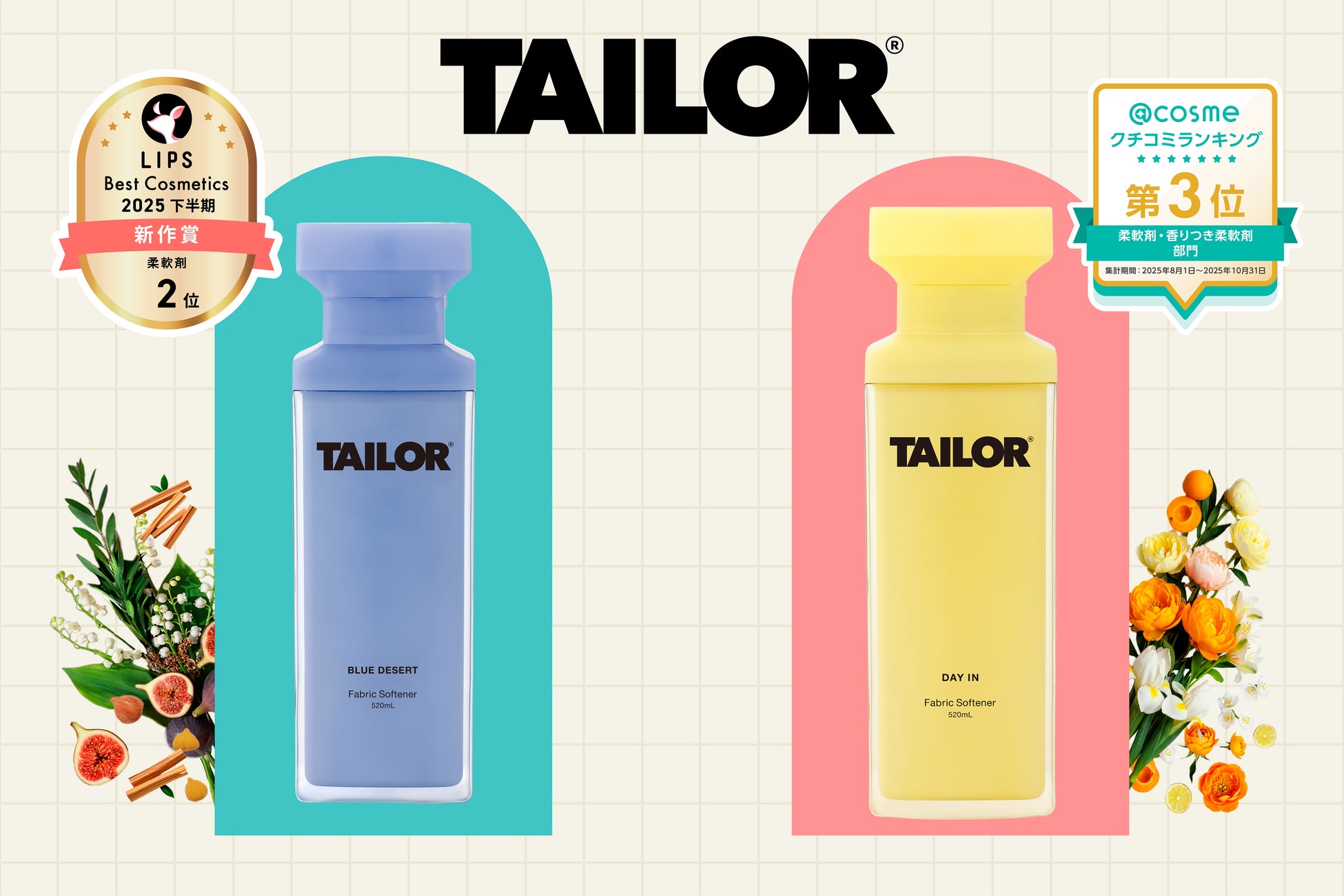 株式会社bridge(本社:東京都港区北青山)より、2025年8月1日に発売されたファブリックケアブランド「TAILOR」の柔軟剤が「LIPSベストコスメ2025 下半期新作賞 柔軟剤部門2位」と「@cosmeクチコミランキング 柔軟剤・香り付き柔軟剤部門3位」を受賞いたしました。