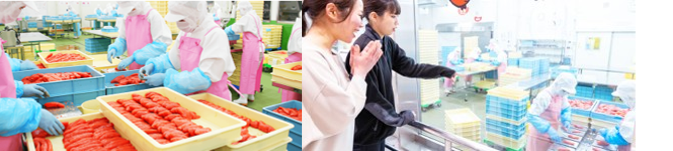 誰でも無料で見学できる「明太子工場ギャラリー」では、原料の下ごしらえから、漬け込み、熟成、計量・整形・包装などの流れを実際に見ることができます。